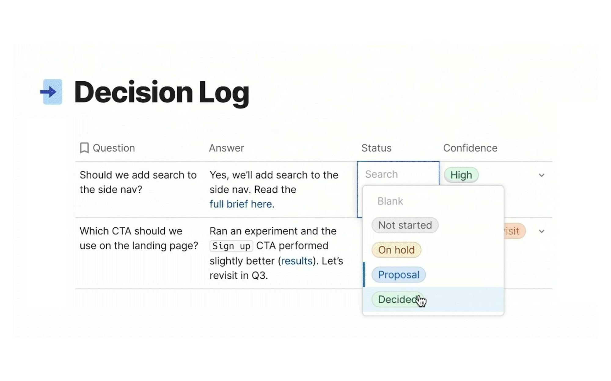 Coda’s integration layer, called Packs, means that you can pull in data from key sources, and push data back out when you need it. That means you can do things like send a customized Slack notification or email to communicate proactively, or pull in the perfect set of Jira data to keep the team on track. You can have confidence that we integrate with your tools given our extensive library of more than 400 Packs. Let’s start with a question. Why is decision making a hot topic on every product team? My view is that a team’s impact is directly tied to their ability to make decisions and have those decisions stick. If that’s the case, then it’s easy to see why decision making is a critical topic for every product team. These days, many decisions are made in live discussions in meetings or within comments in a doc. But too often, the same three problems occur with decision making processes:- Decision rituals aren’t defined.The decision-making ritual itself and the key people aren’t well defined up front, so everyone creates their own process.