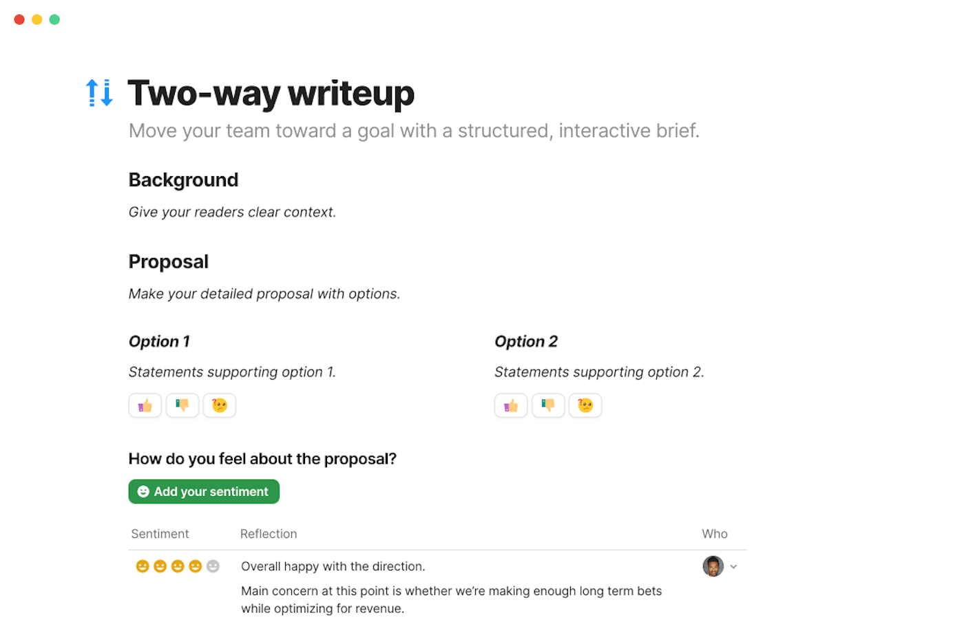 - Decision making — I'd like for us to have a better decision process. In that case, I'd start by creating a template for decisions, and also try using a log for key decisions.