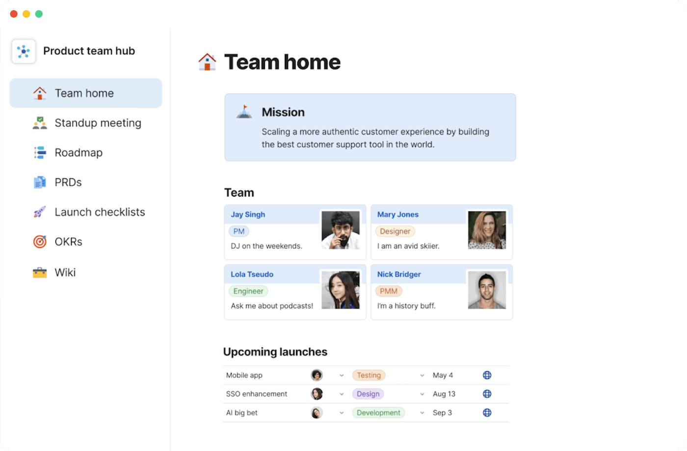 - Bonus, you get a clear historical record. One unexpected outcome of using team hubs for years is that it also creates a nice historical record as new people join the company. So a new person joins and says, “Why did we make that decision?” and in a world of lots of tools, you have to go try to reconstruct history across a bunch of tools. And in our case, you just go find the team hub from that effort, and often it will have good meeting notes or a decision log.