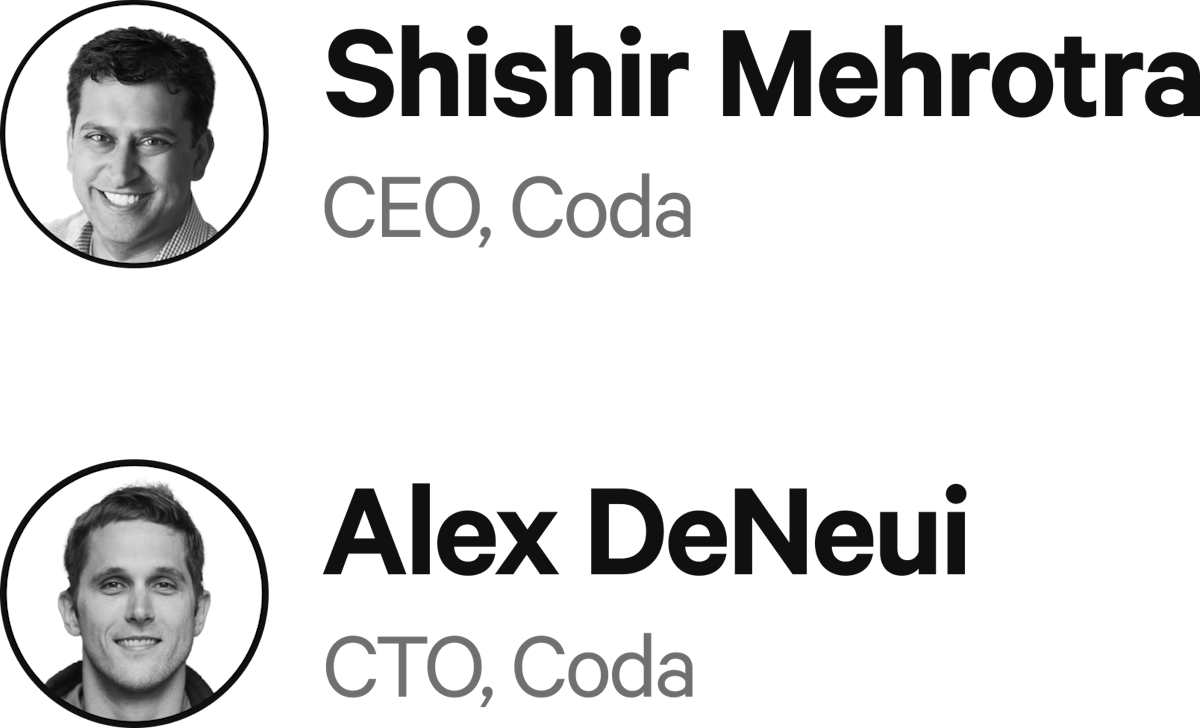 Some things are just meant to be. This sentiment rings true for Coda’s co-founders, Shishir Mehrotra (CEO) and Alex DeNeui (CTO), who first met in college at MIT where Shishir was driven by elaborate spreadsheets and Alex, cranking out code. It was inevitable that these friends, turned co-workers (Microsoft, Google), would find a way to join forces and use their powers to transform the docs and workspace world for the better. Or as we know it today: Coda.