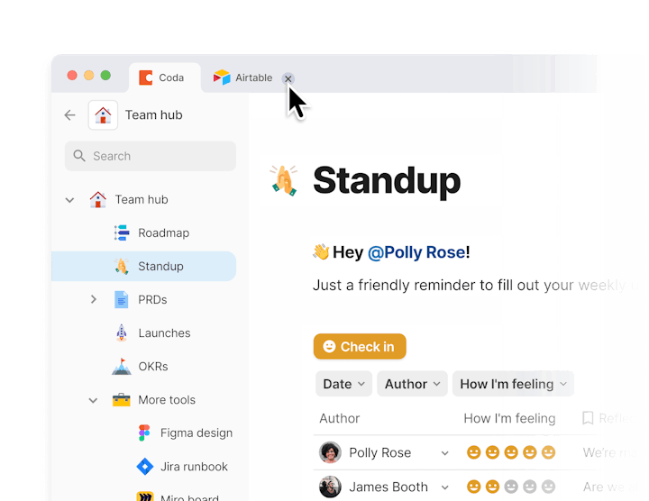 In Airtable, work gets fragmented, siloed and squeezed into boxes. Coda brings your decisions, data, and deadlines together seamlessly, so your team can envision and execute what’s possible, faster.