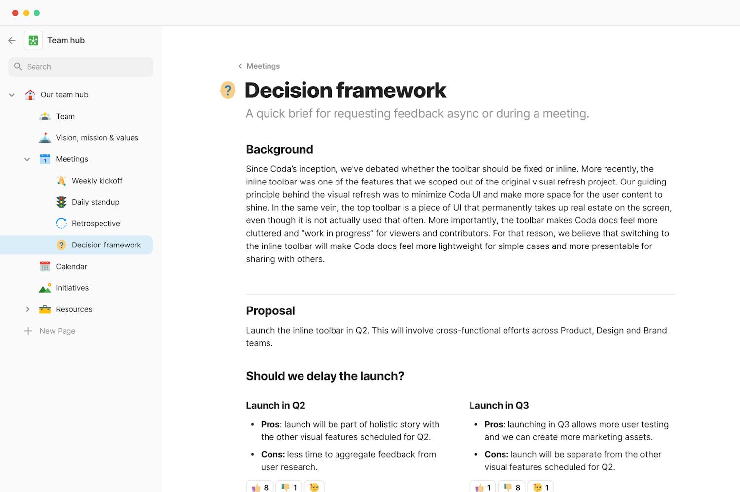 Asana offers project management solutions, but Coda delivers this and more. Coda integrates projects, decision docs, knowledge bases, and real-time collaboration into one unified surface.