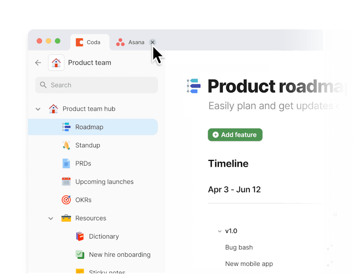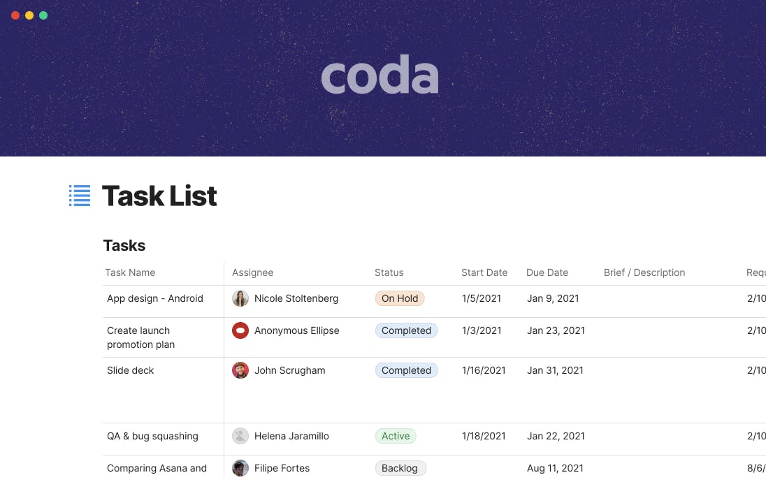 With Asana, you pay to give your entire team access. With Coda, everyone is free to view, edit, comment, and contribute. We only charge for people who create docs.