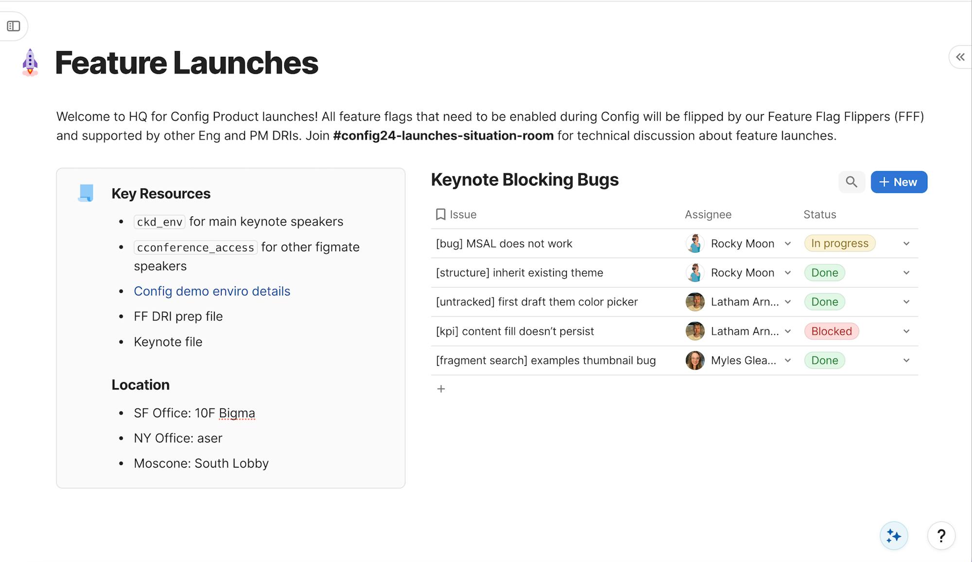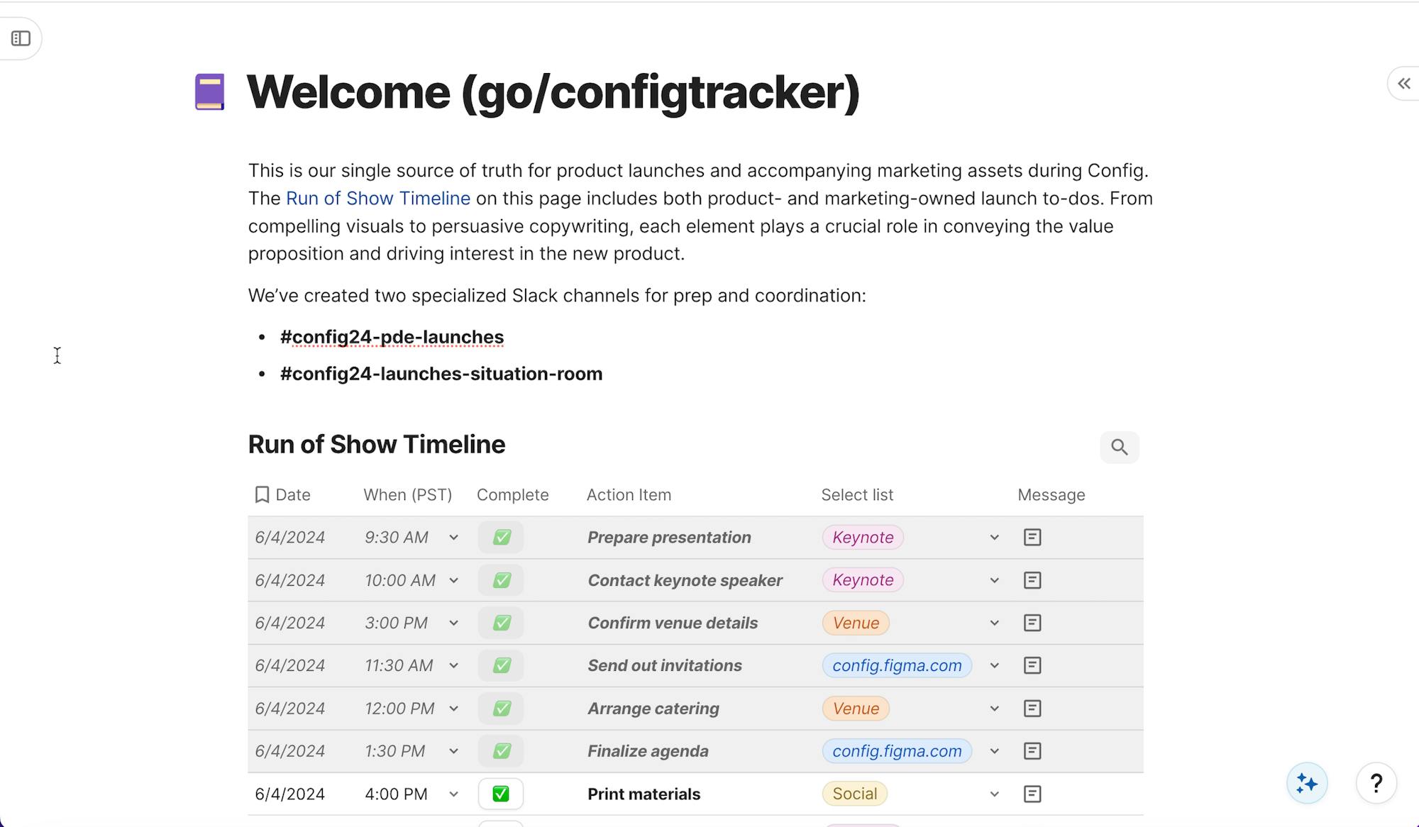 It was exactly 7:59 am on event day and the Figma product and marketing teams anxiously huddled around their laptops, dispersed between two separate rooms at the vast Moscone conference center. Together, they met in their Coda “run of show” doc, which was set up to coordinate the launch of the conference livestreams and over ten product and feature releases. The doc also included the detailed rollout of the post-keynote tweets, email sends, webpage updates, and press releases so cross-functional teams knew exactly when to launch their channels Sixty seconds later, Lawrence clicked a single green button in Coda and each person on the team received a Slack notification that it was time to push the “Day Of” site experience. Config 2024 had officially begun.