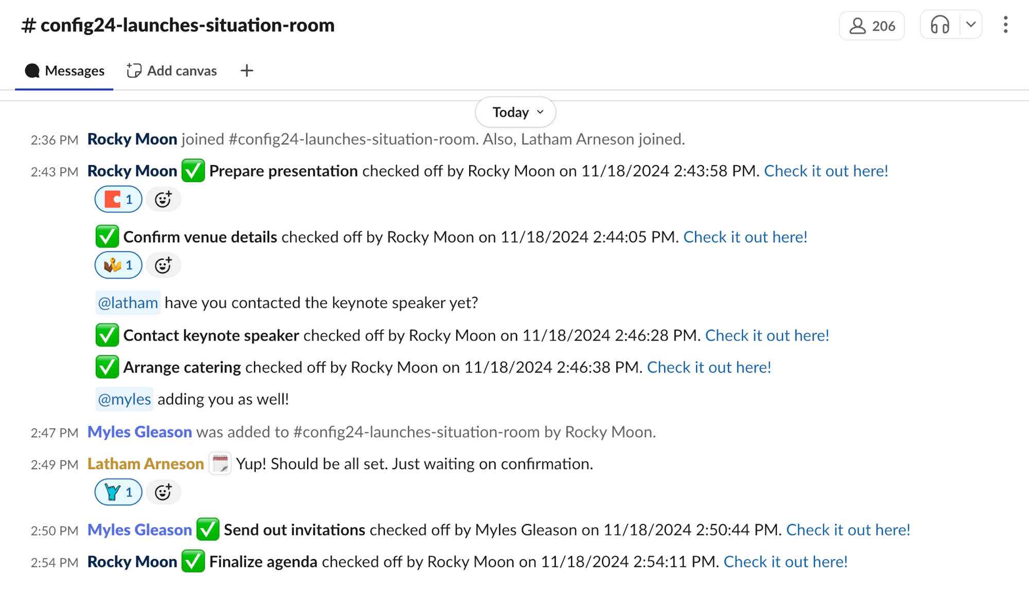 This minute-by-minute process played out over the ensuing day, with the launch process for 91 “mini-events” jumping from Coda to Slack and back again, all behind the scenes as conference attendees were able to simply enjoy the nearly flawless experience. Virginia, Andrew, Lawrence, and the rest of their teammates had worked extremely hard for this moment. Leading up to Config, teams had been able to work in whatever environment fit their specific needs. This day demanded absolute alignment. To remove any confusion, it was key that the run of show, feature and marketing launch information, as well as bug-bashing discussions, were all in one spot. Coda’s Slack integration was truly a star, as Virginia put it, “The combination of Coda and Slack was really helpful, it made it easy to problem-solve in real time and we were able to keep everyone updated in our coordination channel so each team member was ready to do their part as pieces went live.”
