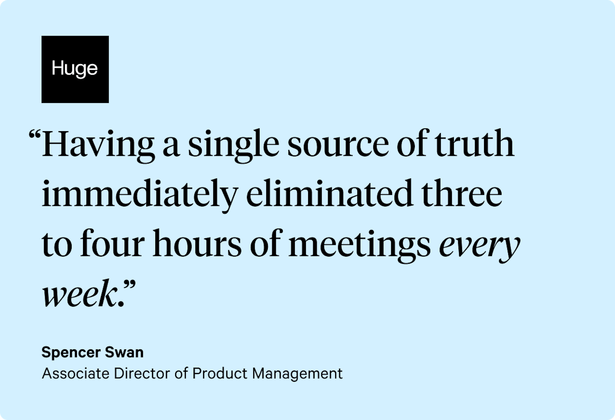 On top of that, Huge had no standard way of tracking their work. “Each region had their own tradition and way of doing things,” says Lauren Woodmansee, Group Director of Product Strategy & Product Management. Every new add to every project wasted valuable hours getting up to speed on how the work was done, instead of diving straight into the work itself. There wasn’t a standardized onboarding process for new clients either. To explain the next steps to clients, teams would have to dig through presentations for previous clients and repackage them to tell the whole story. There wasn’t a single source of truth the account team could pass to new team members or client stakeholders that allowed them to find all the up-to-date information, so Huge had slow onboarding times that often delayed project delivery. This was a logistical problem for the organization, but it also grated with the specific culture of Huge’s team. “Huge has intrinsically motivated teams that take proactive action, so they need a shared living single source of truth to give them context to do their work, or else we have to meet,” says Swan. Sometimes, taking initiative even slowed things down, when proactive employees moved forward on things without access to necessary information.After: Fewer meetings, faster transitions.