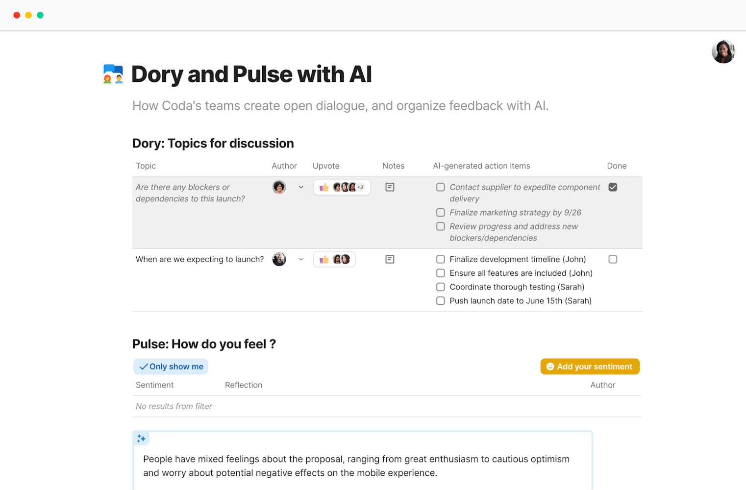 “We used Notion for 1.5 years and then performance issues made it difficult for us to continue using it as a source of truth. I know with Coda the performance is going to be there, it’s going to scale with us, and people enjoy using it.”