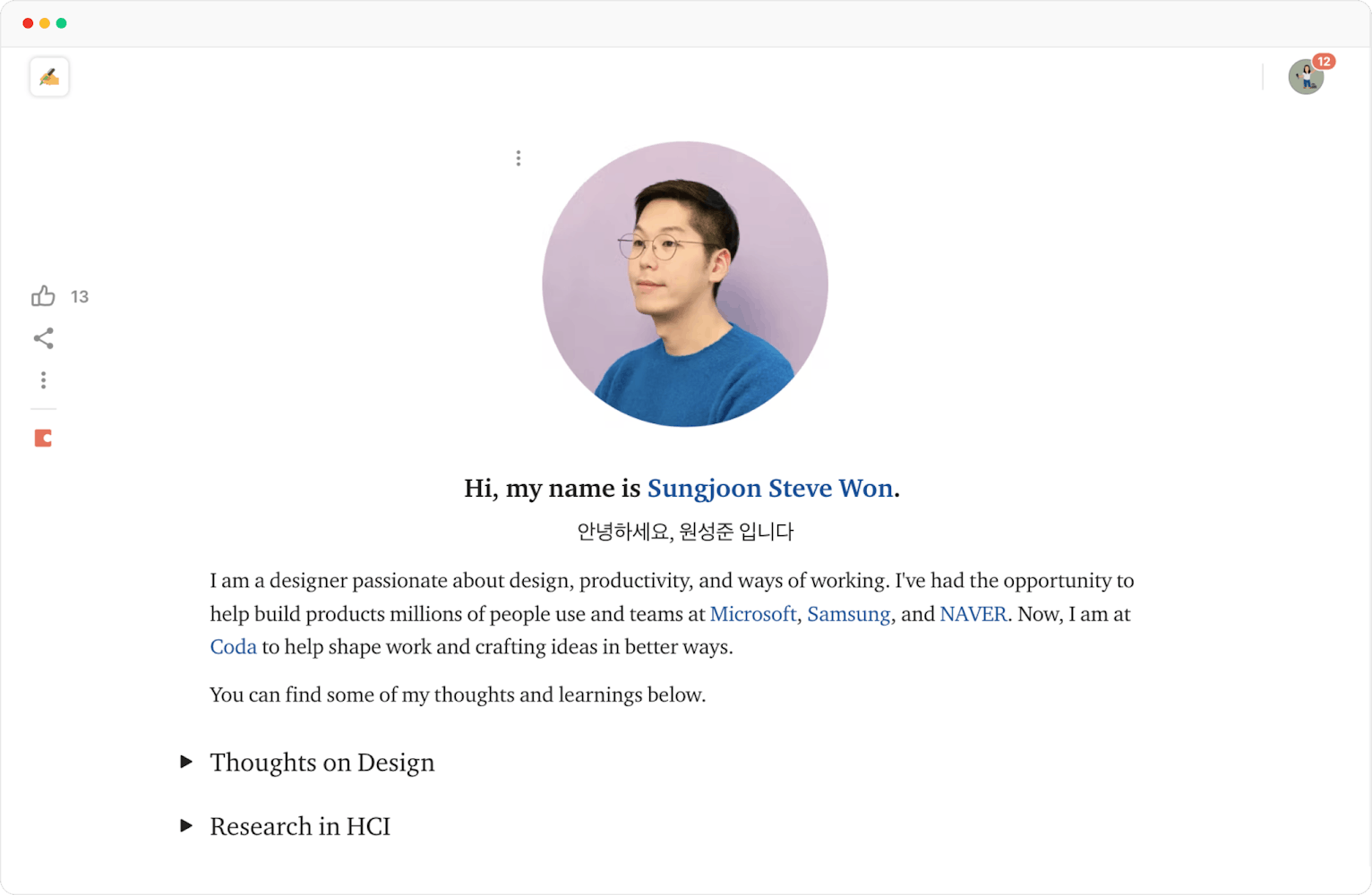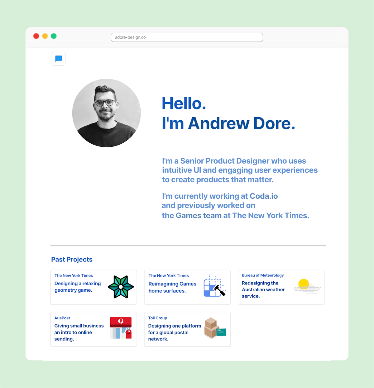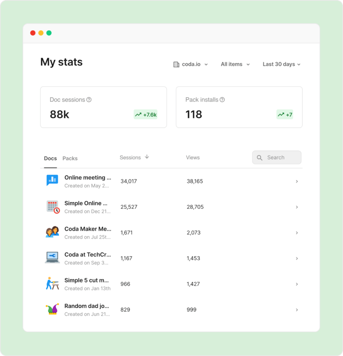 Coda lets you turn any doc into a sleek, shareable website with a customizable URL. And because it’s a doc, you can easily edit and evolve your site whenever you feel like it.