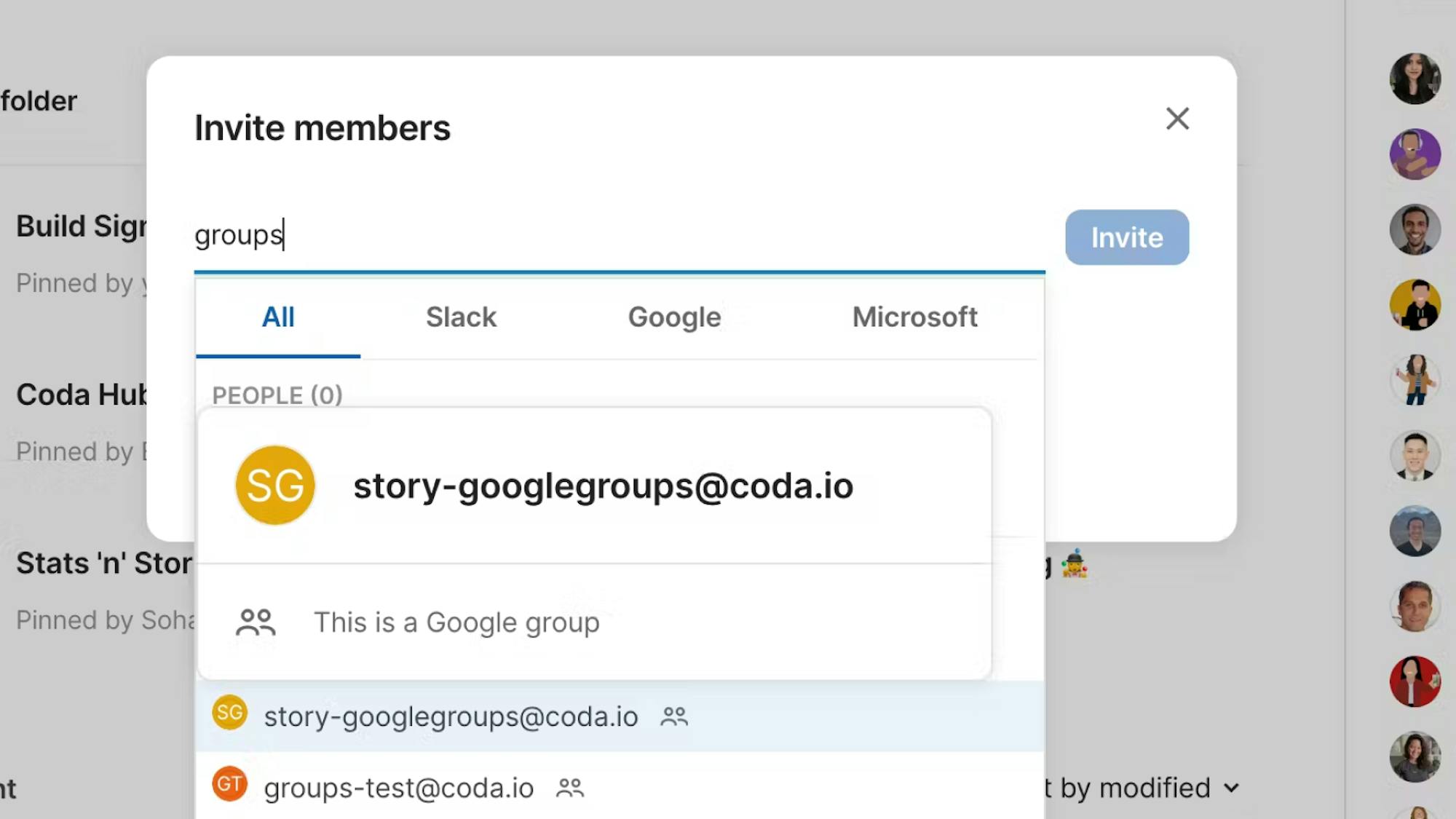 Easily share content in Coda and manage permissions by sharing docs and folders with Google groups.