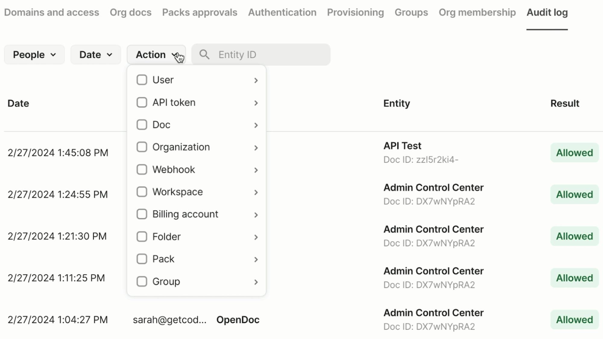 Enterprise org admins can now view and analyze audit events directly within org settings. Filters allow custom views of the audit trail for specific people, actions, or date ranges to easily track what’s been going on in your docs.