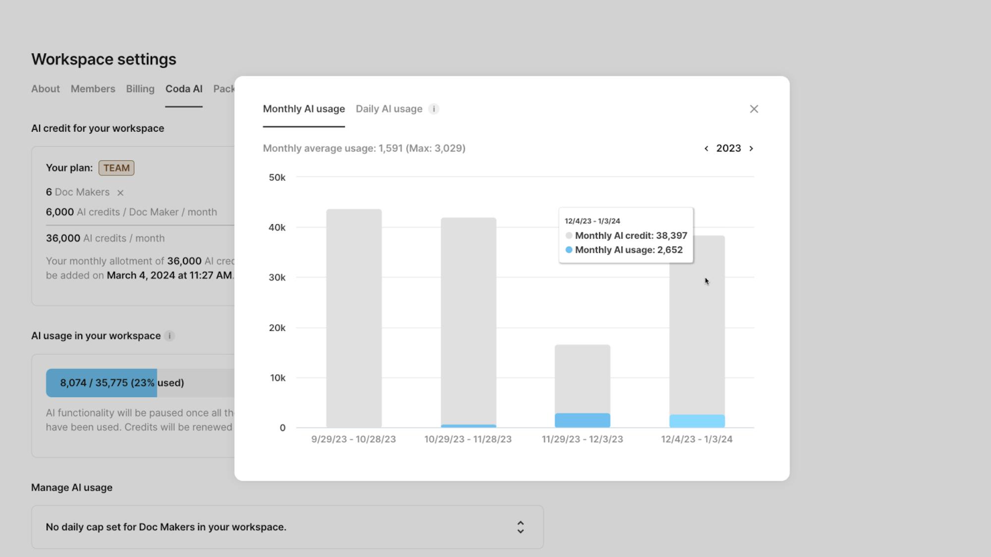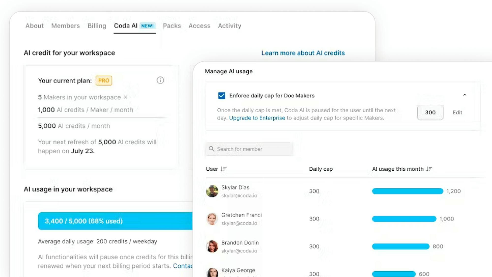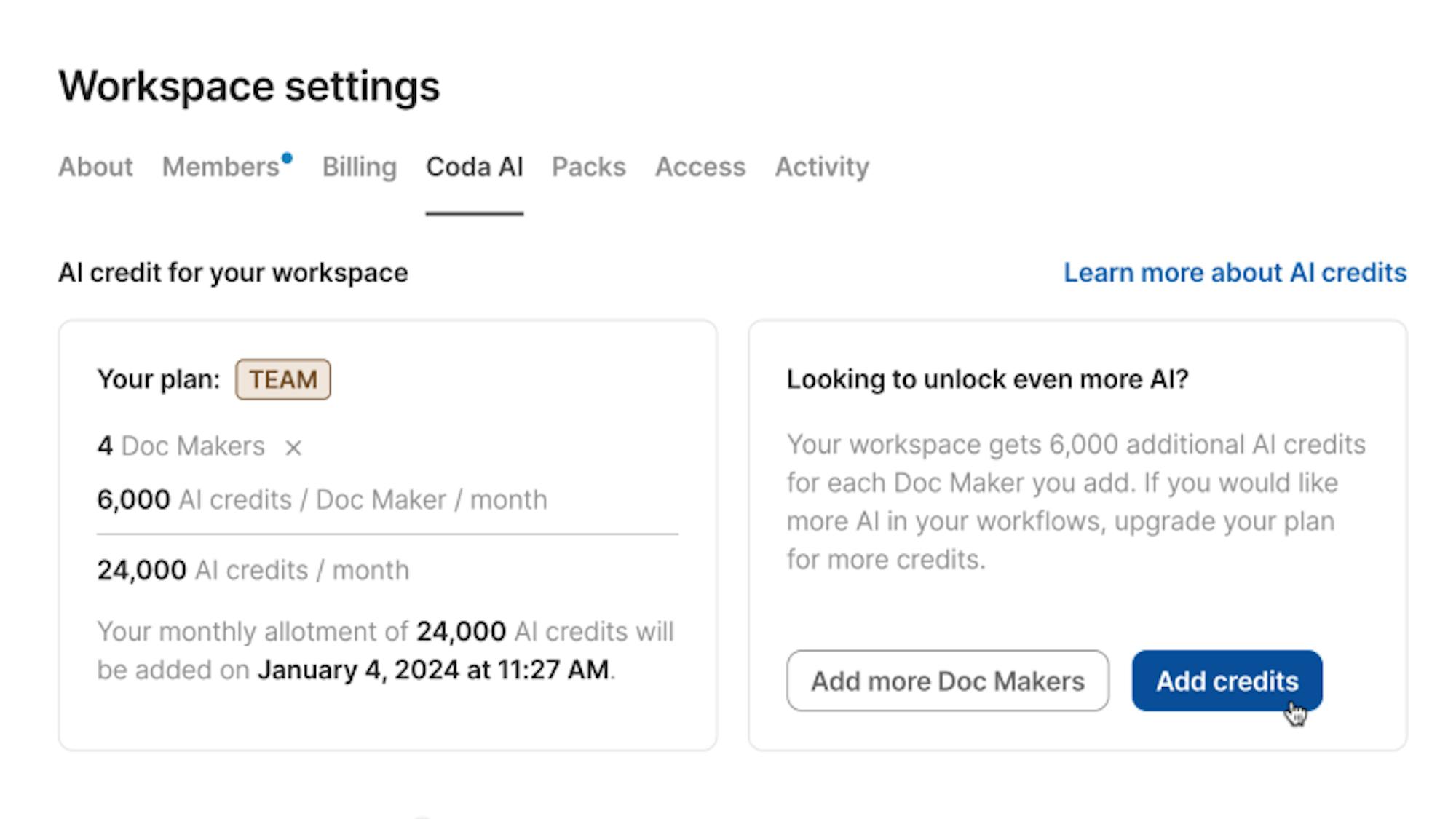 Admins can track and manage AI usage by workspace and user, get more AI credits, and see other useful details under workspace settings.