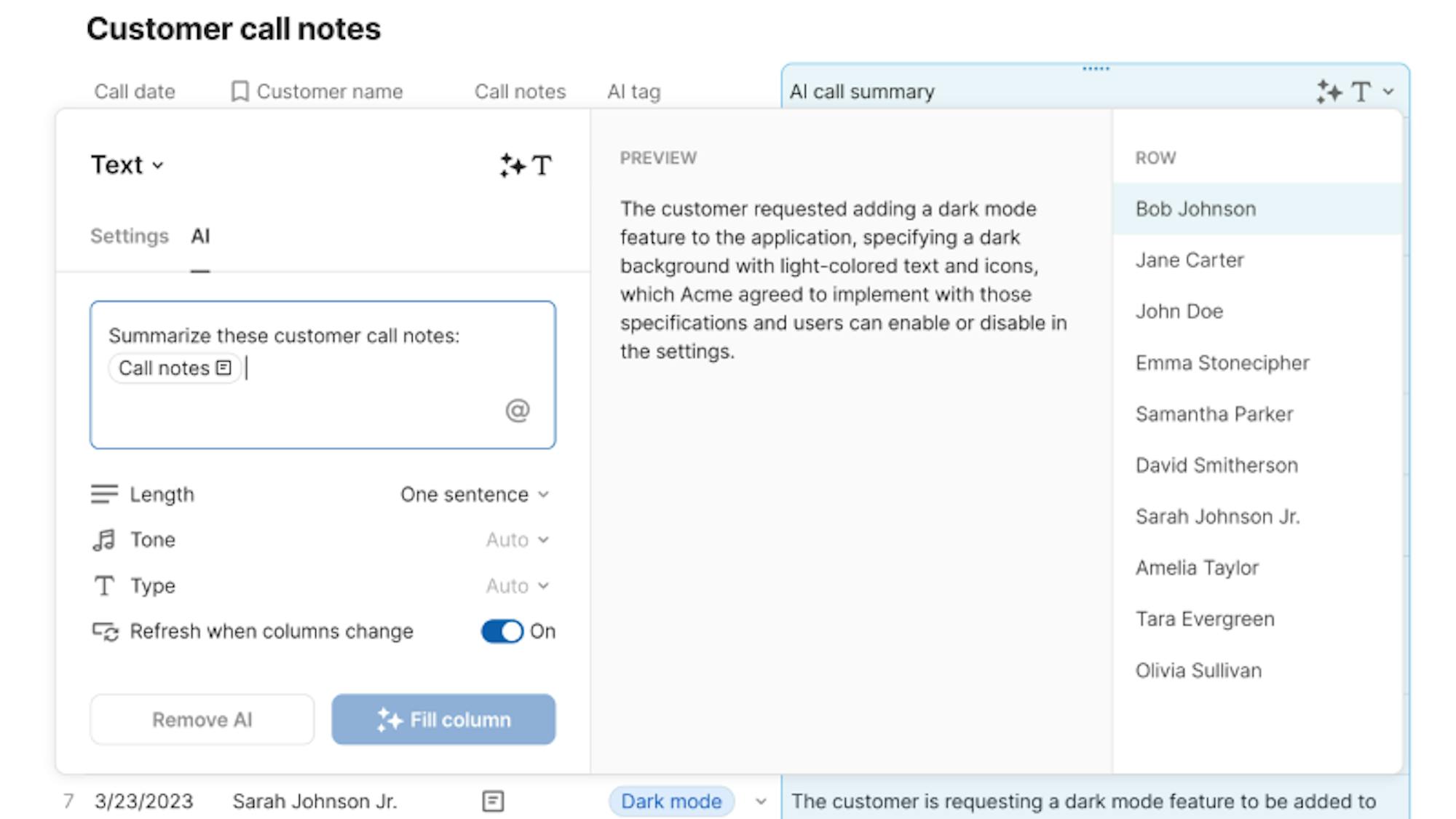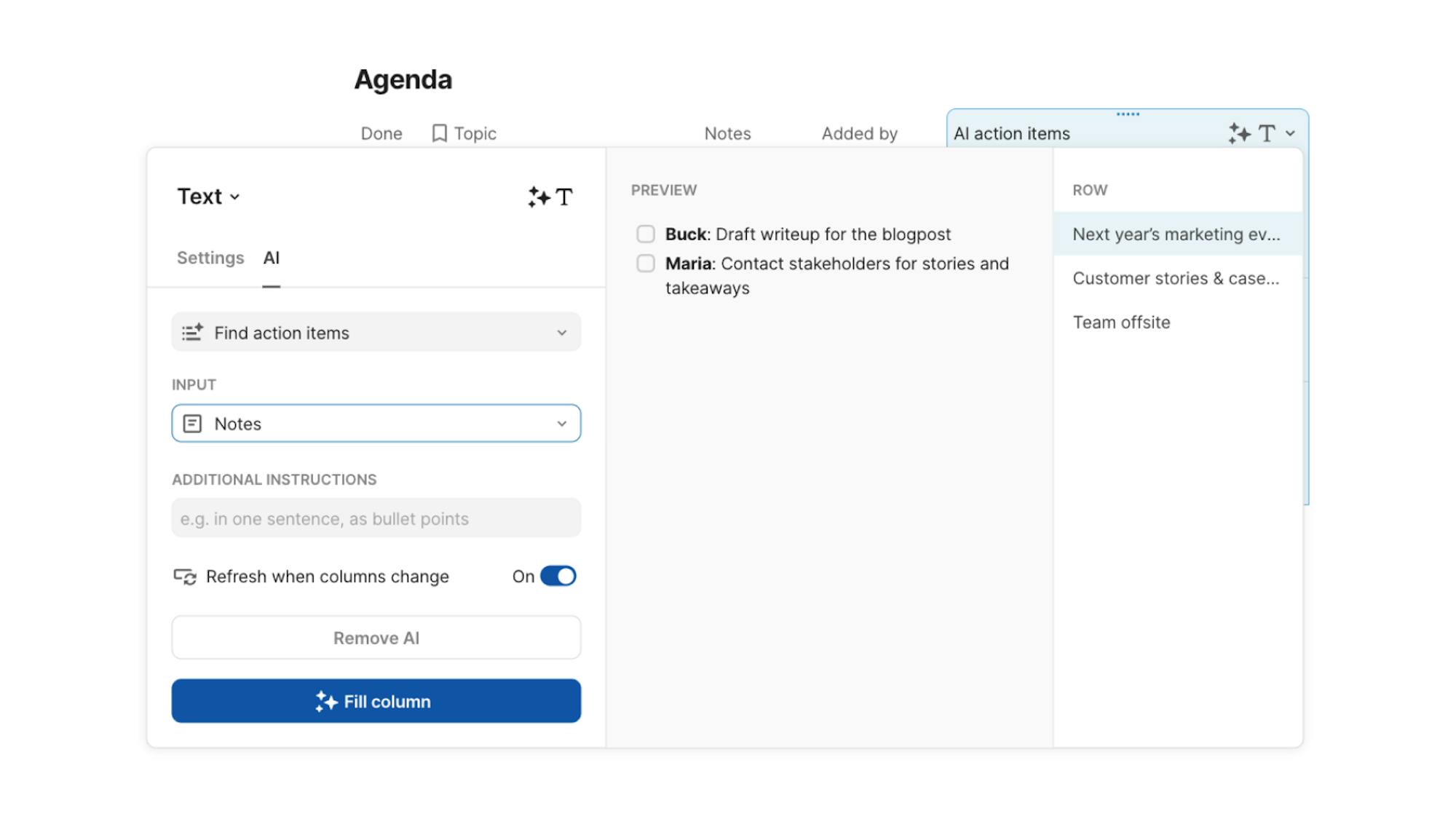 Easily summarize, find action items, or get insights from data in another column.