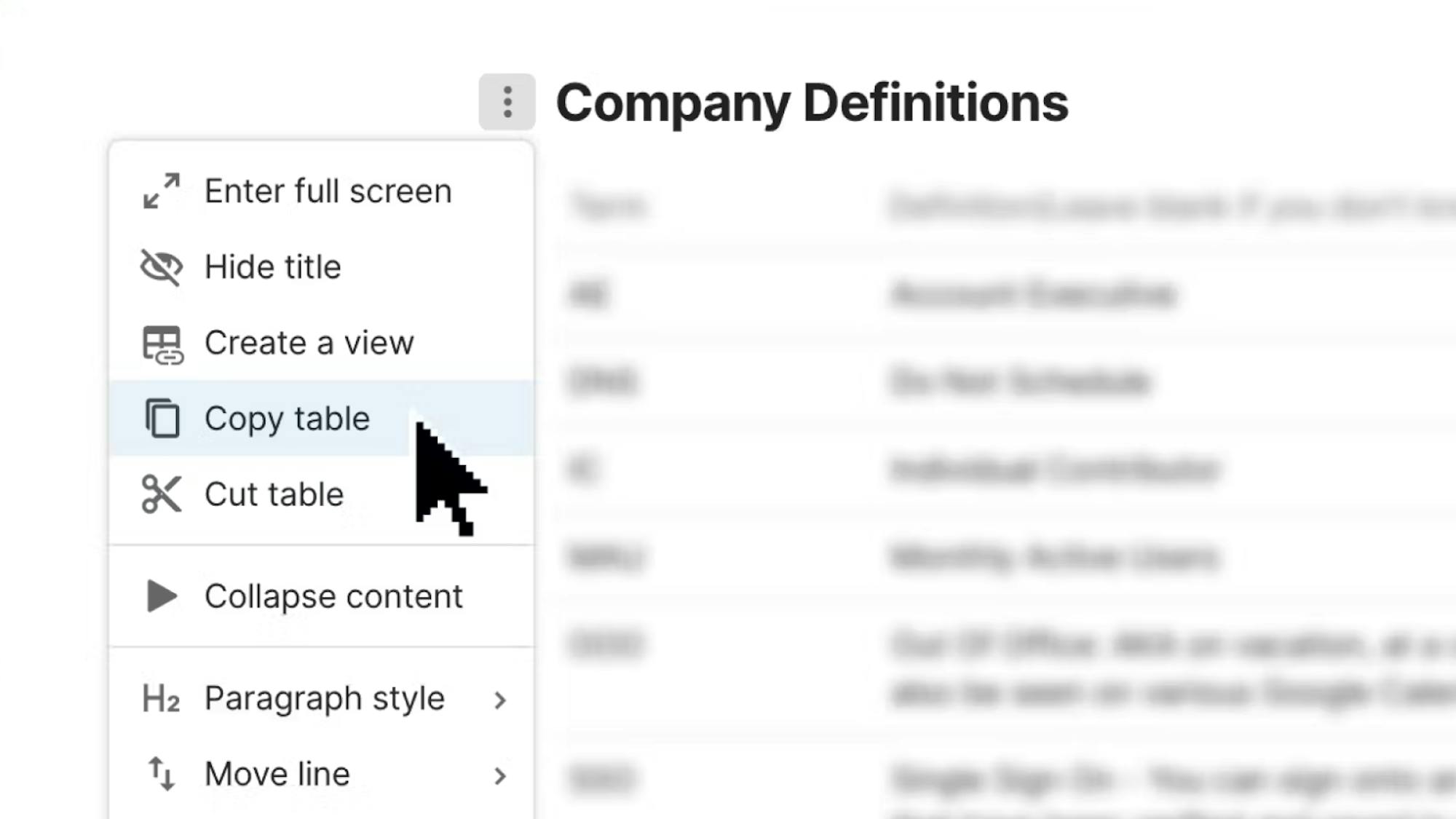 - Copy a page to another doc: Hover over the three dots menu “...” in your page list to copy a page to a new or existing doc.