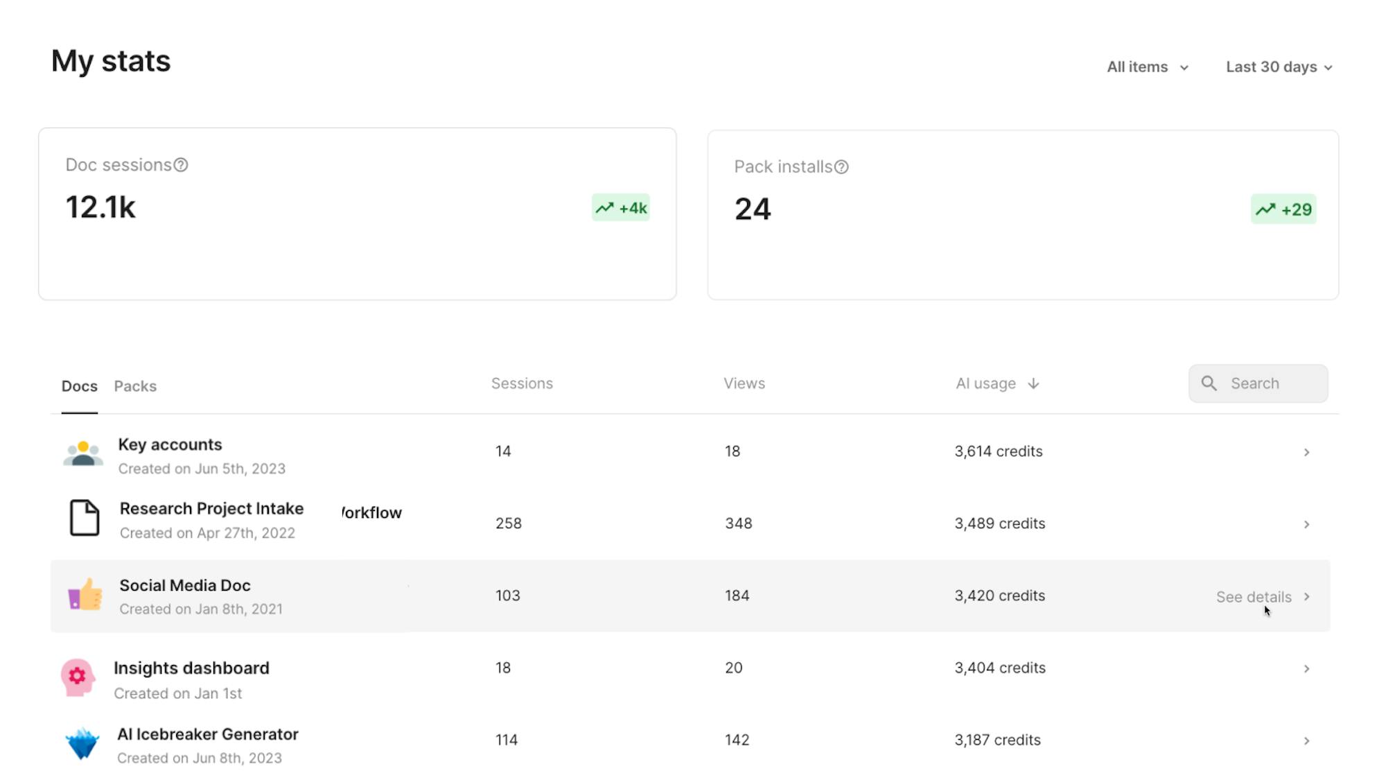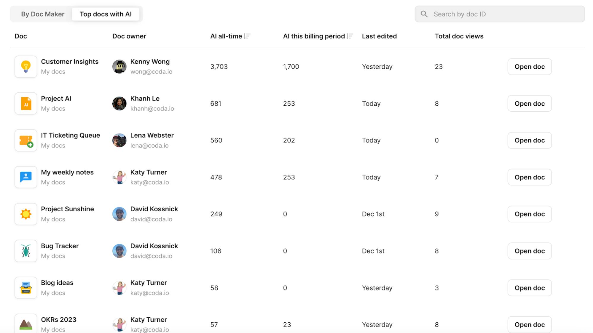 Makers on enterprise teams can view Coda AI analytics for top docs in their workspace.