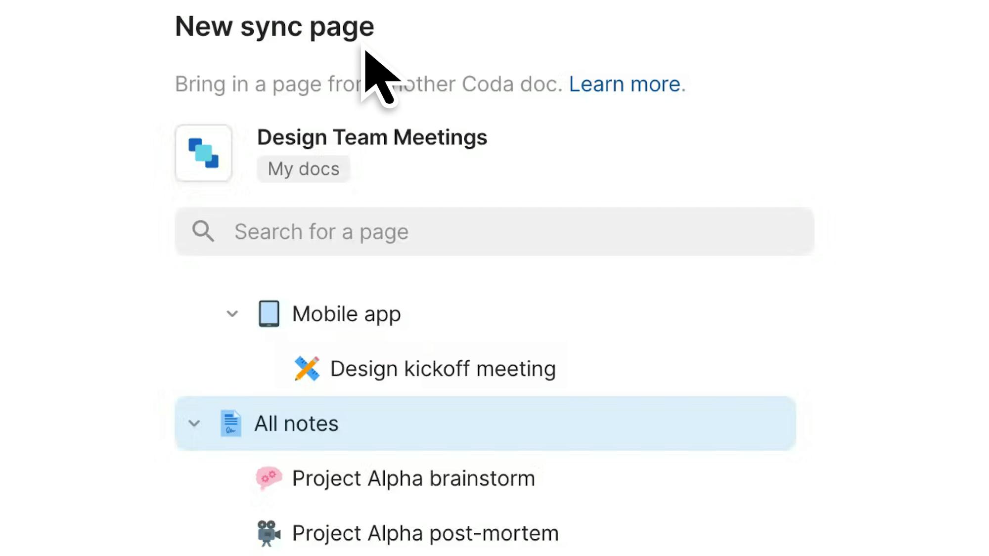 Find what you're looking for faster. Searching across Coda docs, pages, and even workspaces is more accessible, accurate, and easy to navigate.Better linking between Coda docs