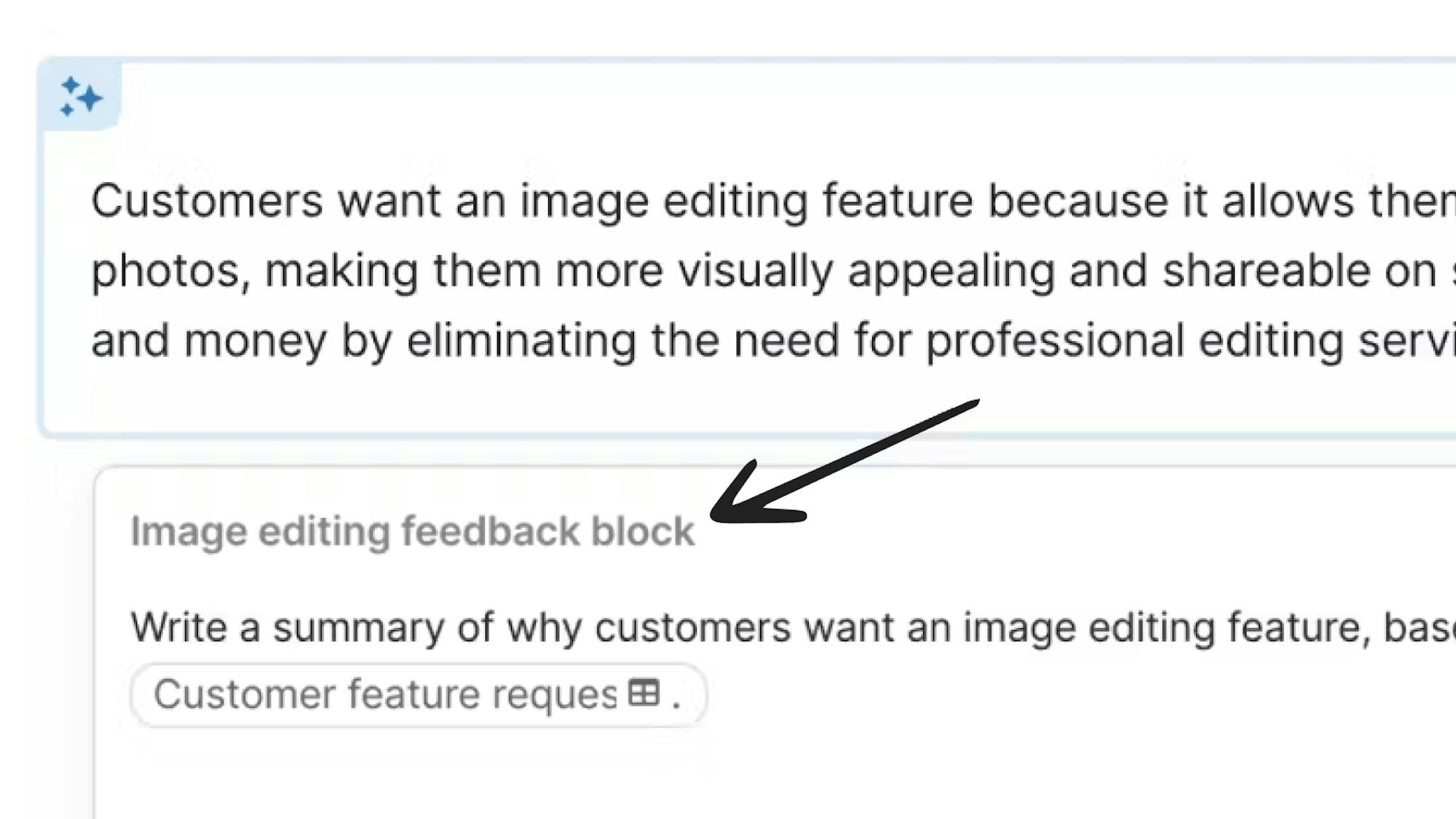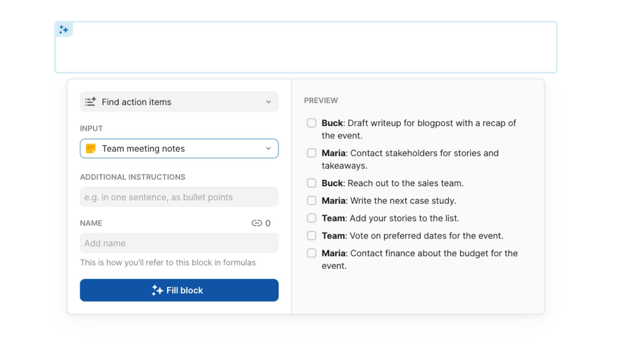 - AI block: Your go-to insights block. Great for pulling out summaries and action items, converting data to text, and more.