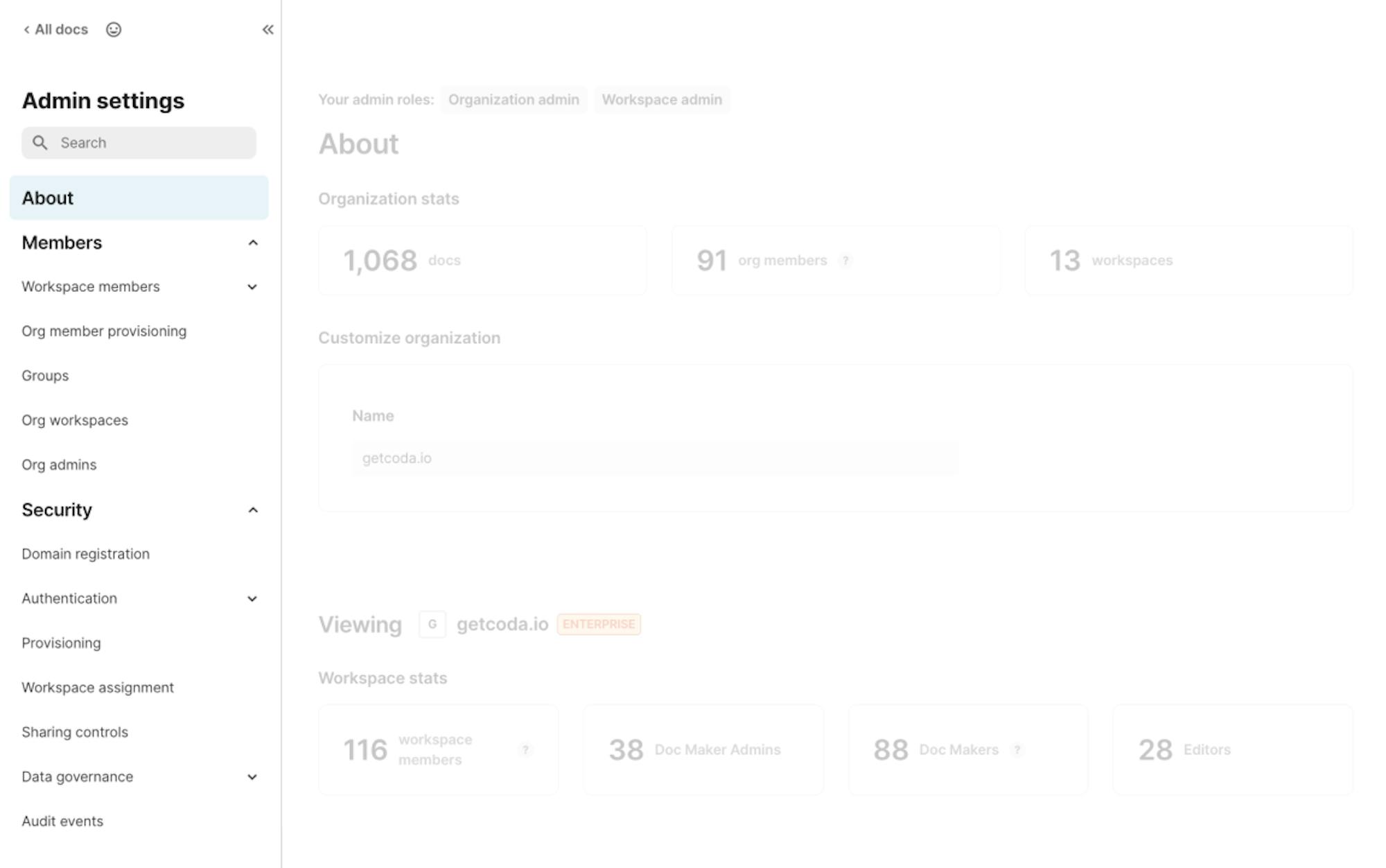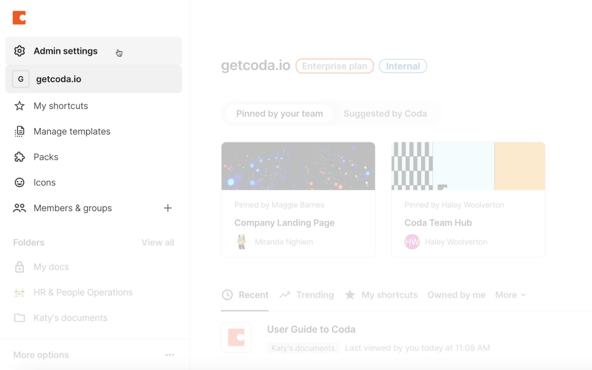 Org admins and workspace admins can now both access their respective settings in the upper left panel of their Coda home page, making it easier to find.