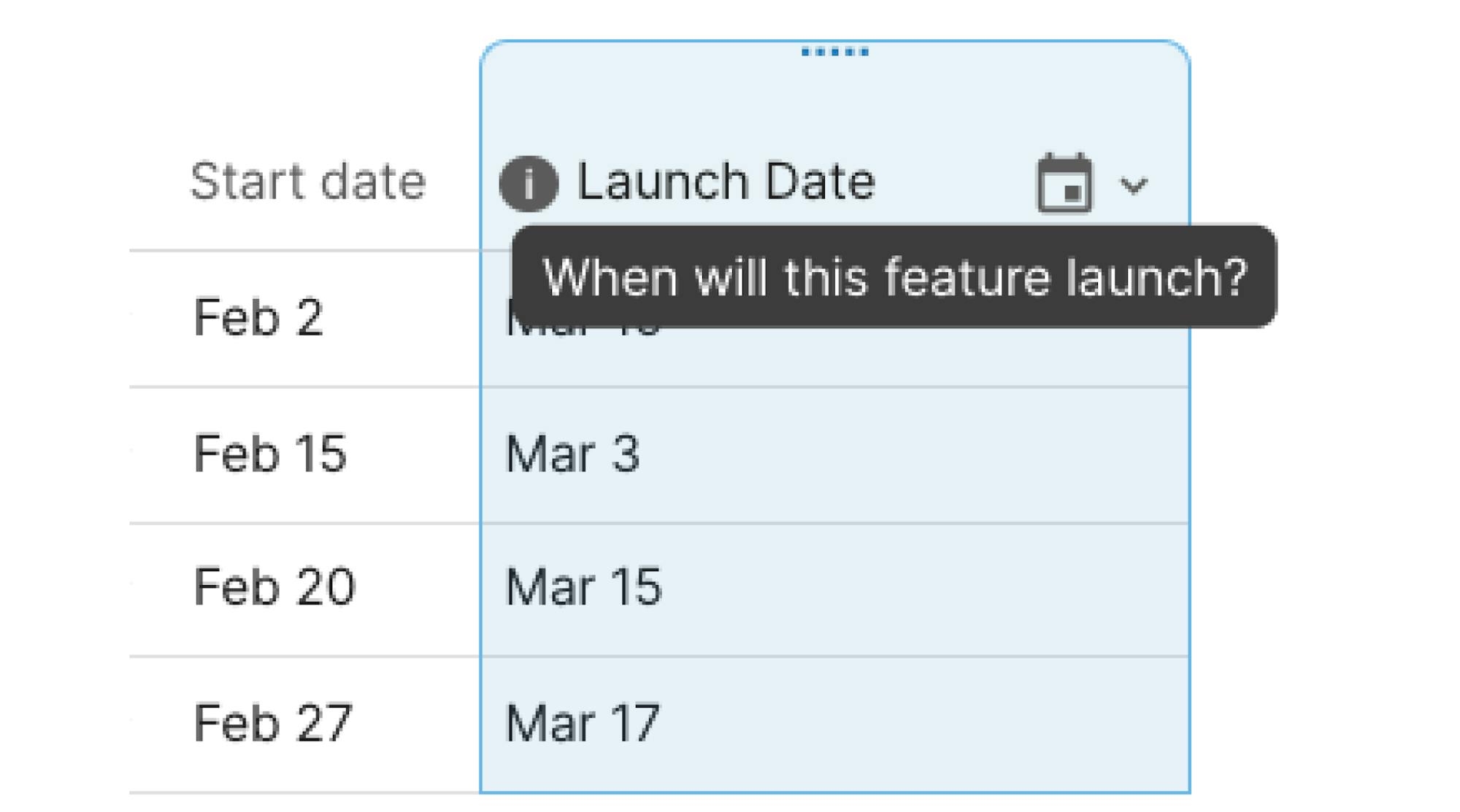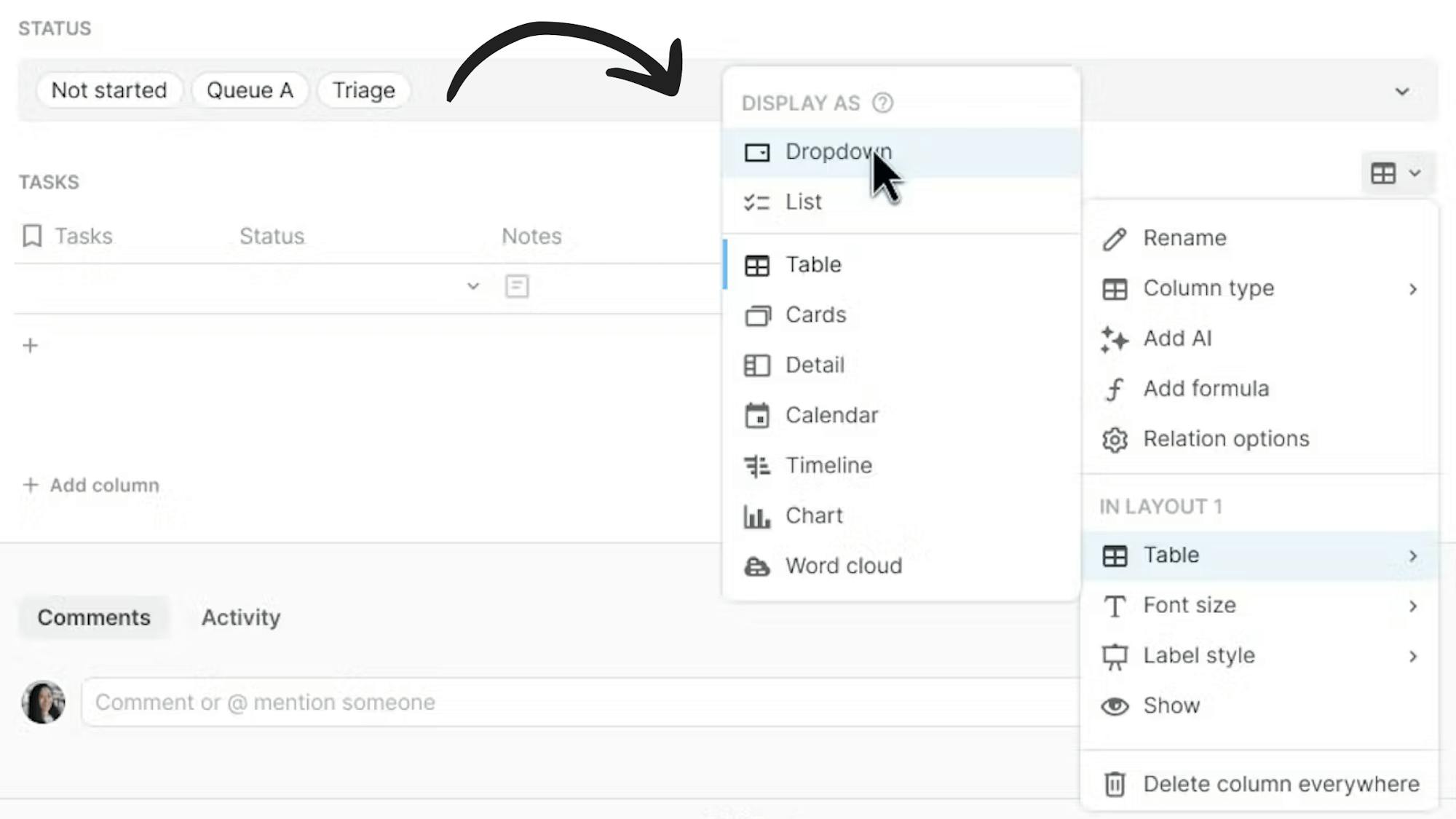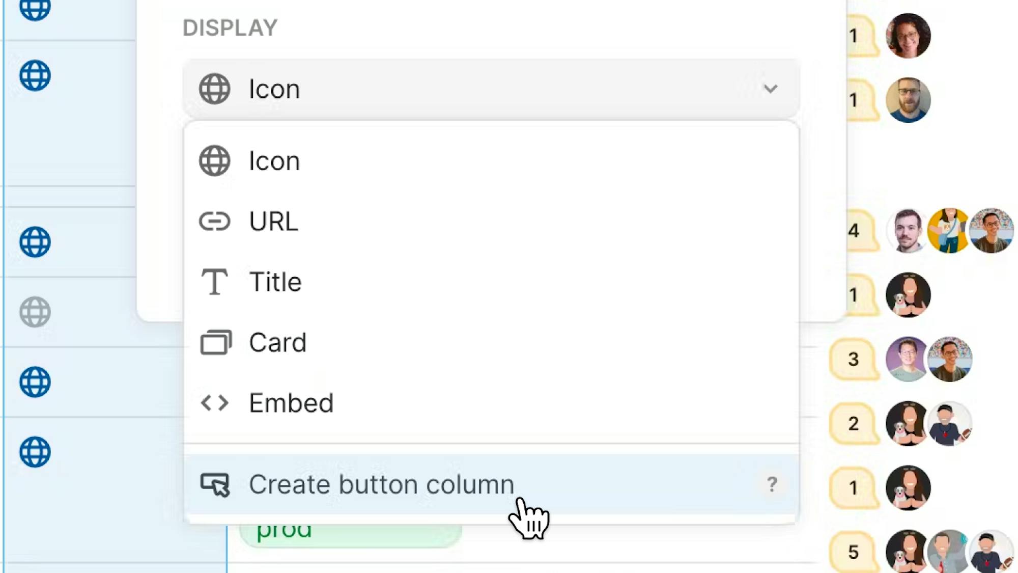 - Customize columns in a row modal: Hover over the column and use the inline options to customize a column name or type.