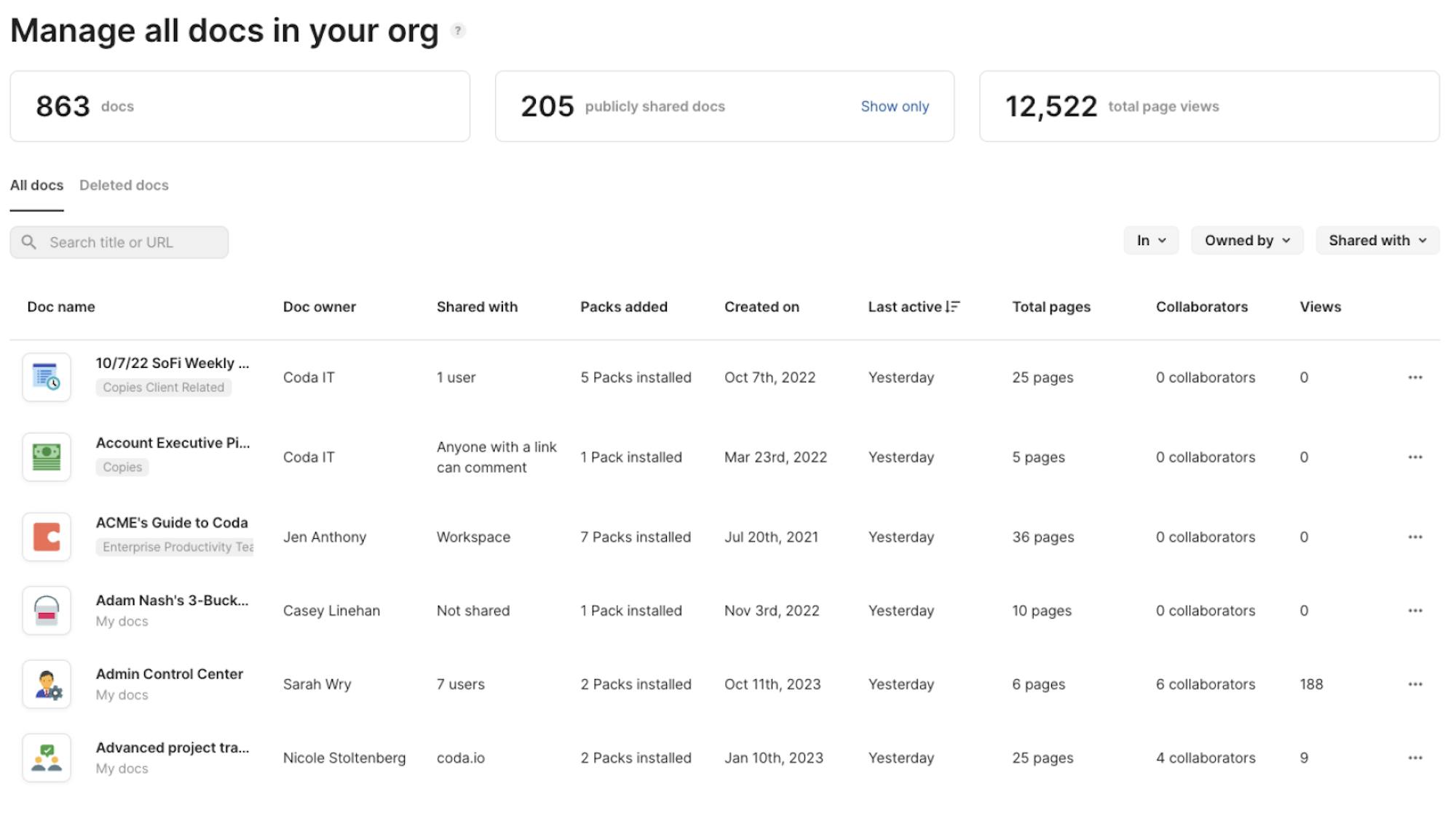 There's a new one-stop shop for doc analytics. Admins can see high-level aggregated stats, sort to find recently updated or popular docs, and filter docs by workspace, folder, doc owner, and how the doc is shared.