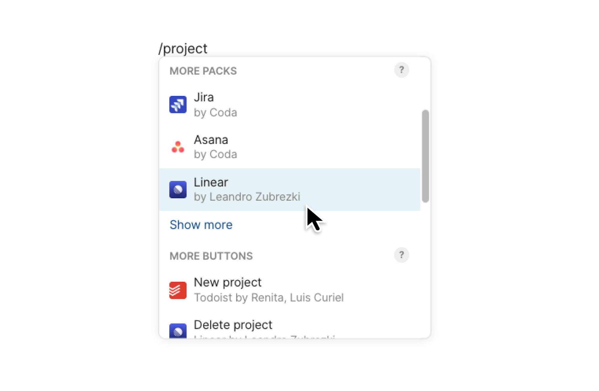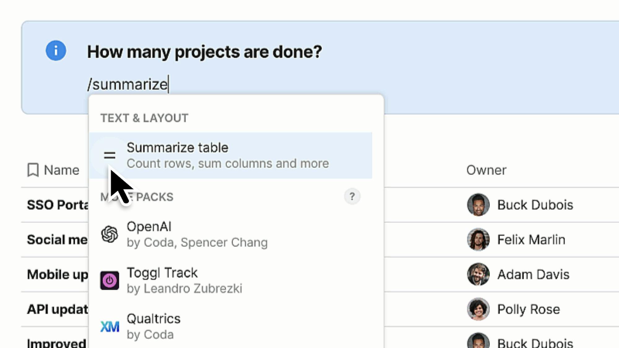 You can search for a use case or category, like "project tracker" or "time management," and Coda will find the Packs, sync tables, buttons, and other building blocks that you need. Try it by searching in the / menu or the insert panel.
