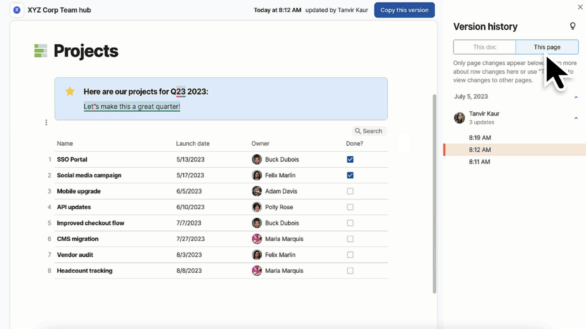 When looking at your doc’s history, easily review changes for a relevant page without bring distracted by other pages.