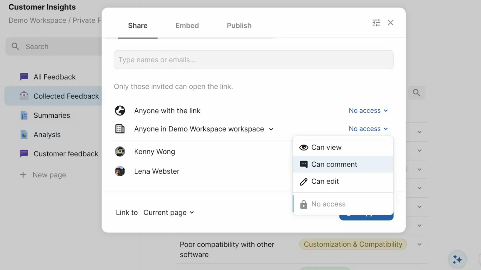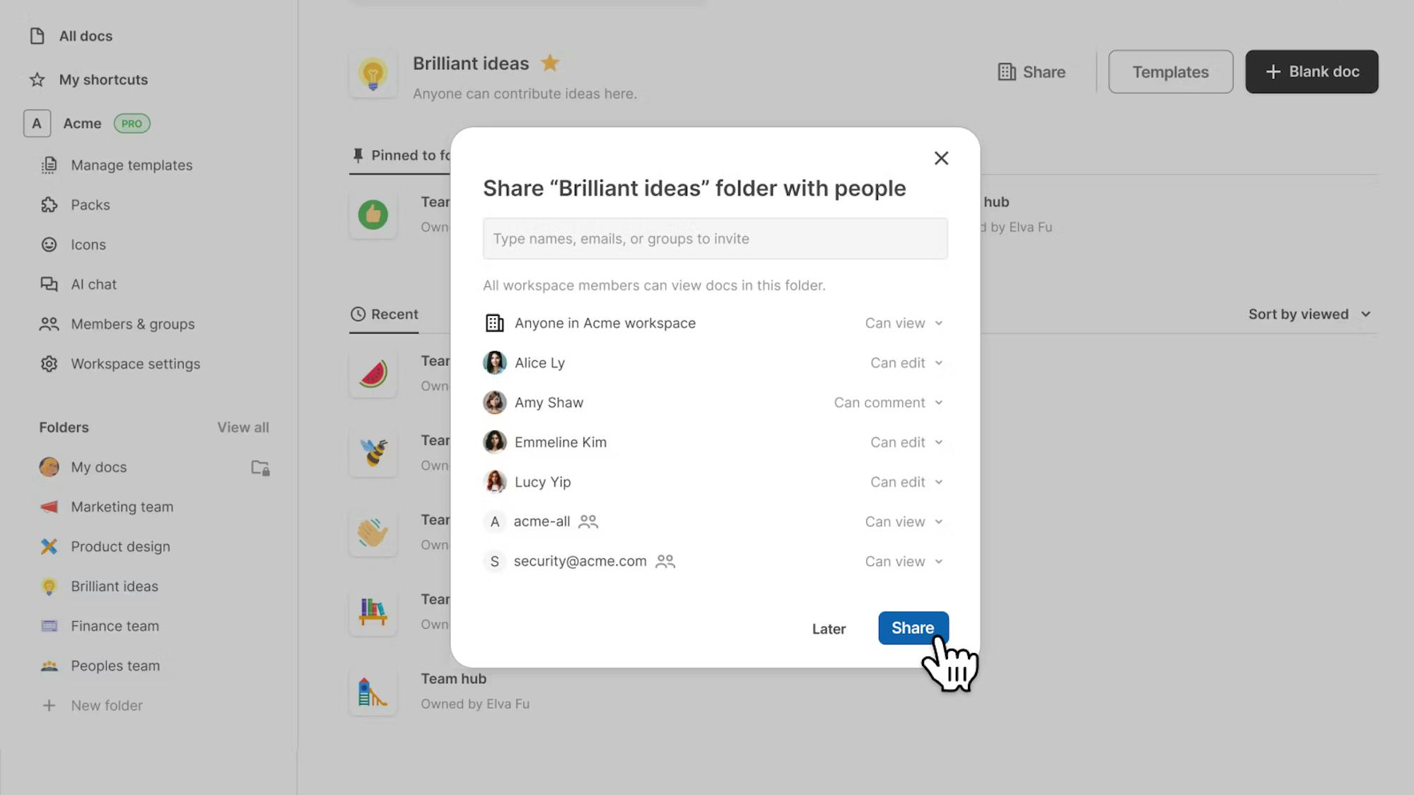 When sharing a folder, you can now specify the level of access (view, comment, or edit) given to users. Frequently used folders can be added as a shortcut that appears on the lefthand menu of your workspace.