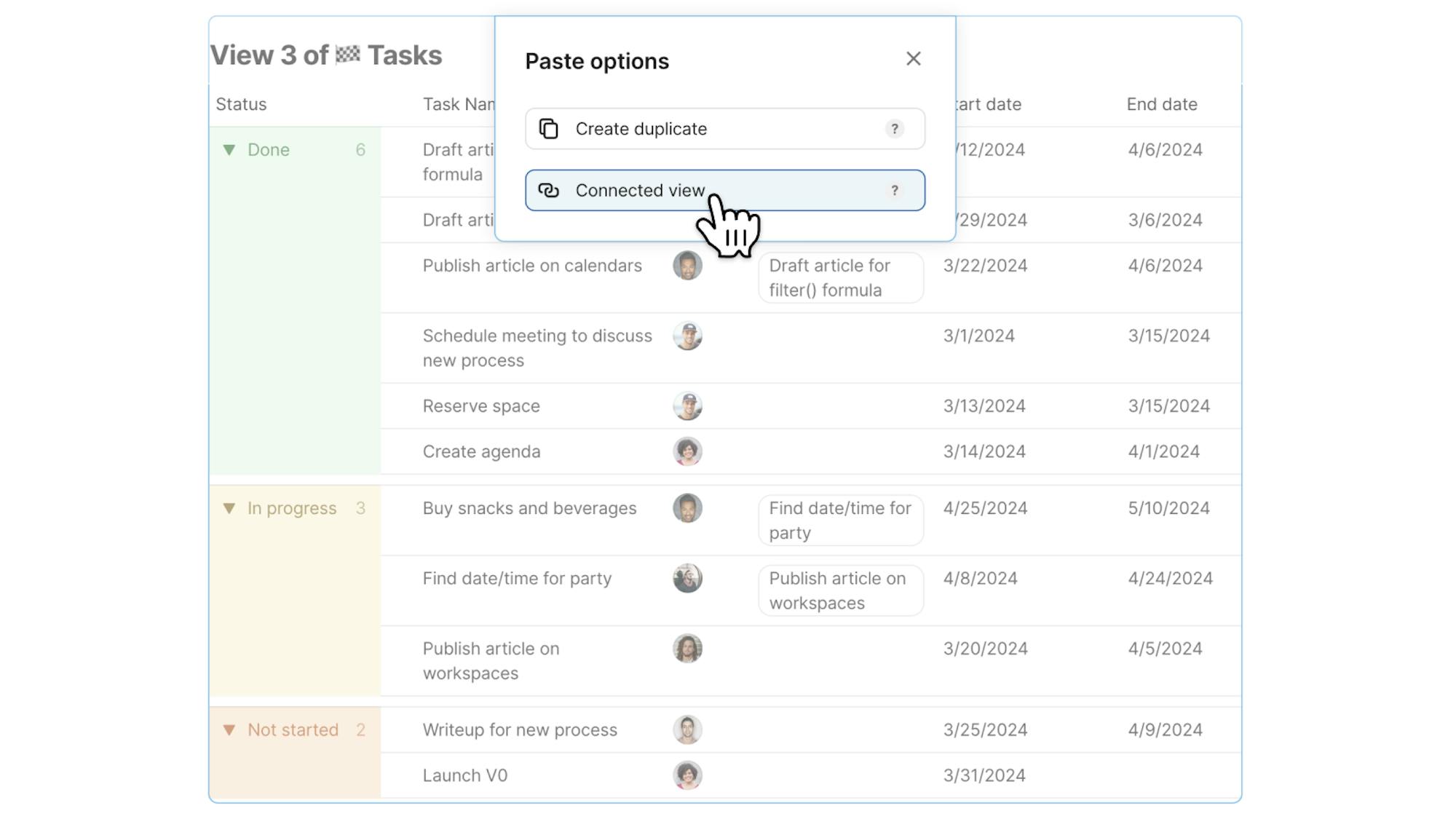 Pasting a table will offer a clear option of creating a connected view or duplicating data, to prevent accidental data overrides.