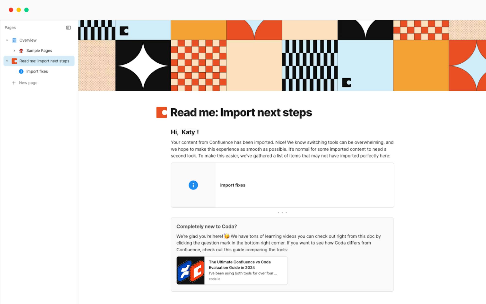 After you use the Confluence, Notion, or Airtable importer, your doc will now include both your imported content, and two more pages with helpful resources, and suggested changes to finish the migration process.