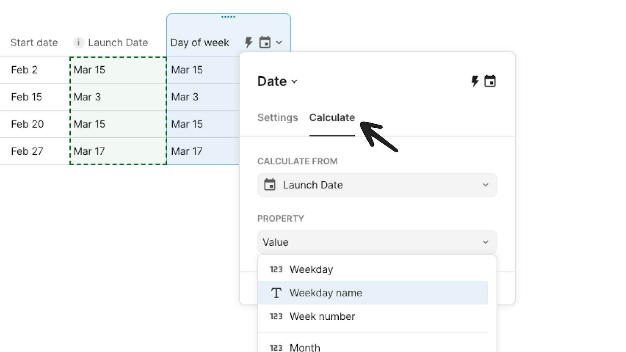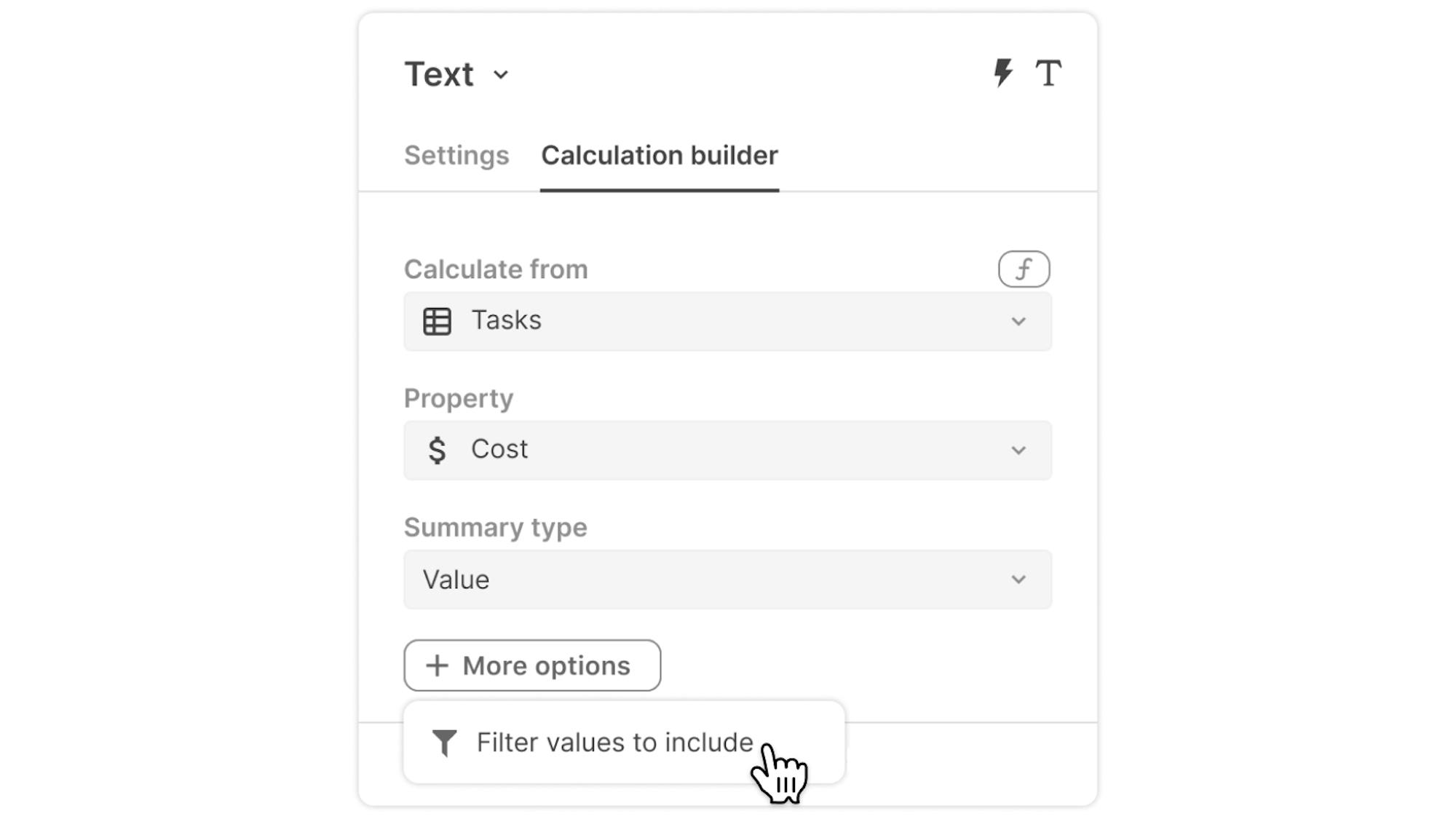 Perform common column calculations like date, text, percentages, and more using a structured builder based on other columns in the table or row properties instead of writing a formula.