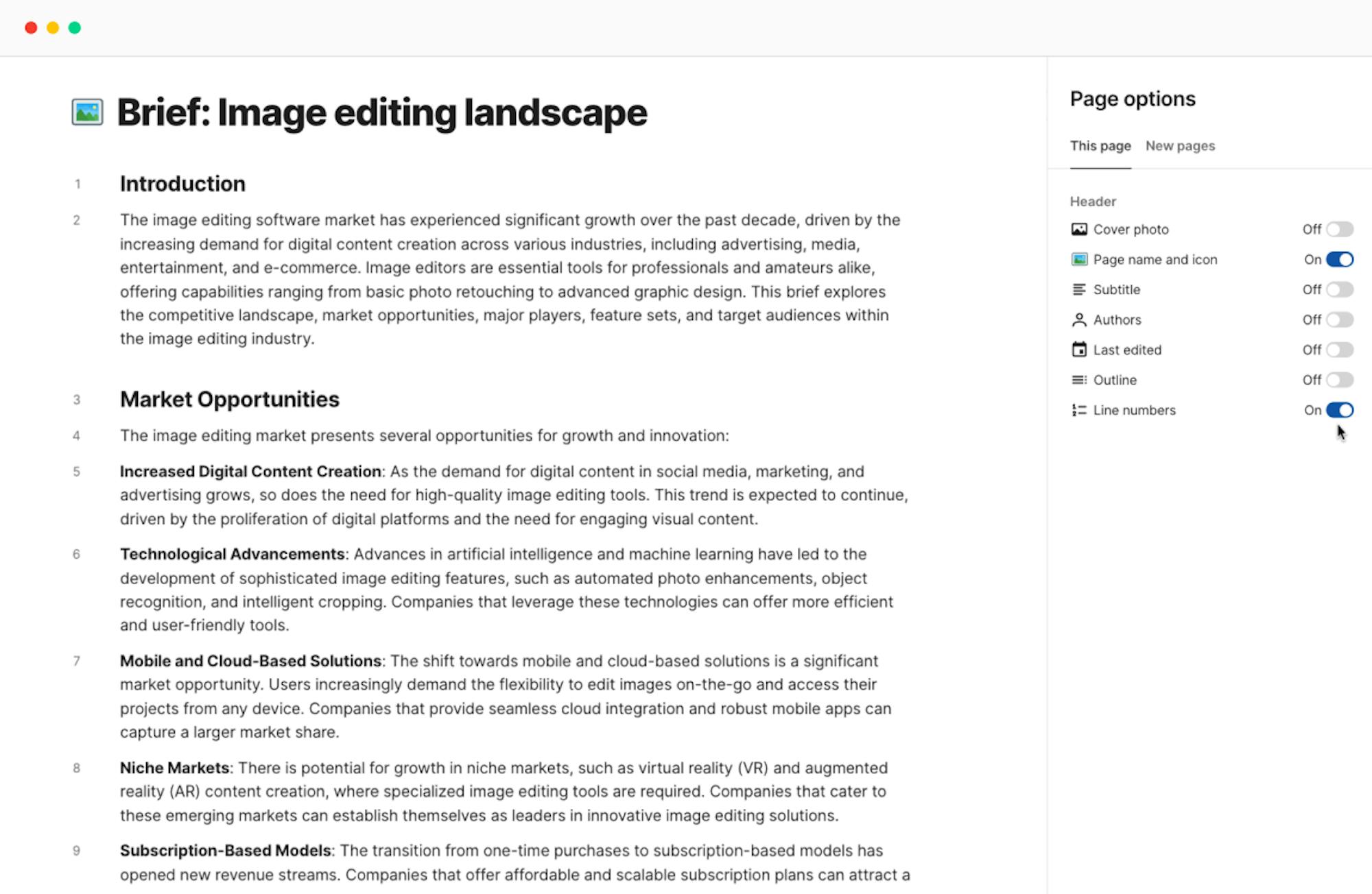 If you’re discussing a doc with your team, you can add line numbers (for each line break) to make sure everyone is reviewing the same content.
