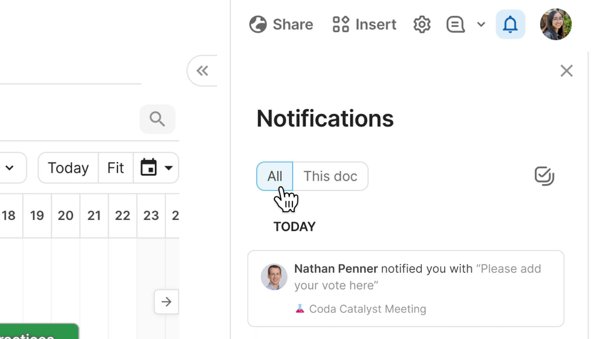 Notifications have a new home where you can see all your notifications or filter to your current doc. We’ve also refreshed the settings menu, making it clearer to navigate.