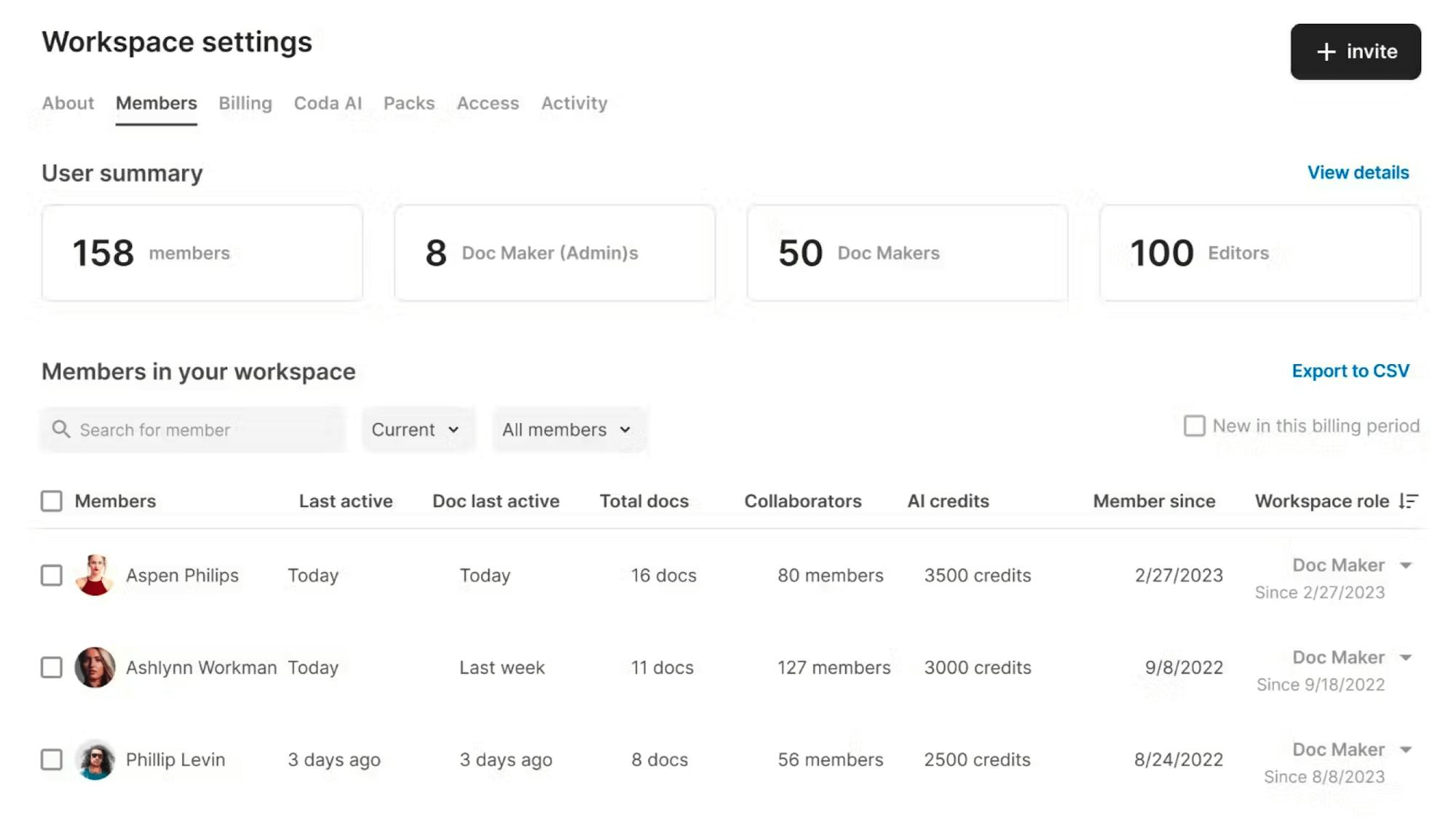 Admins can easily manage their workspace with a list of workspace members along with information on their activity.