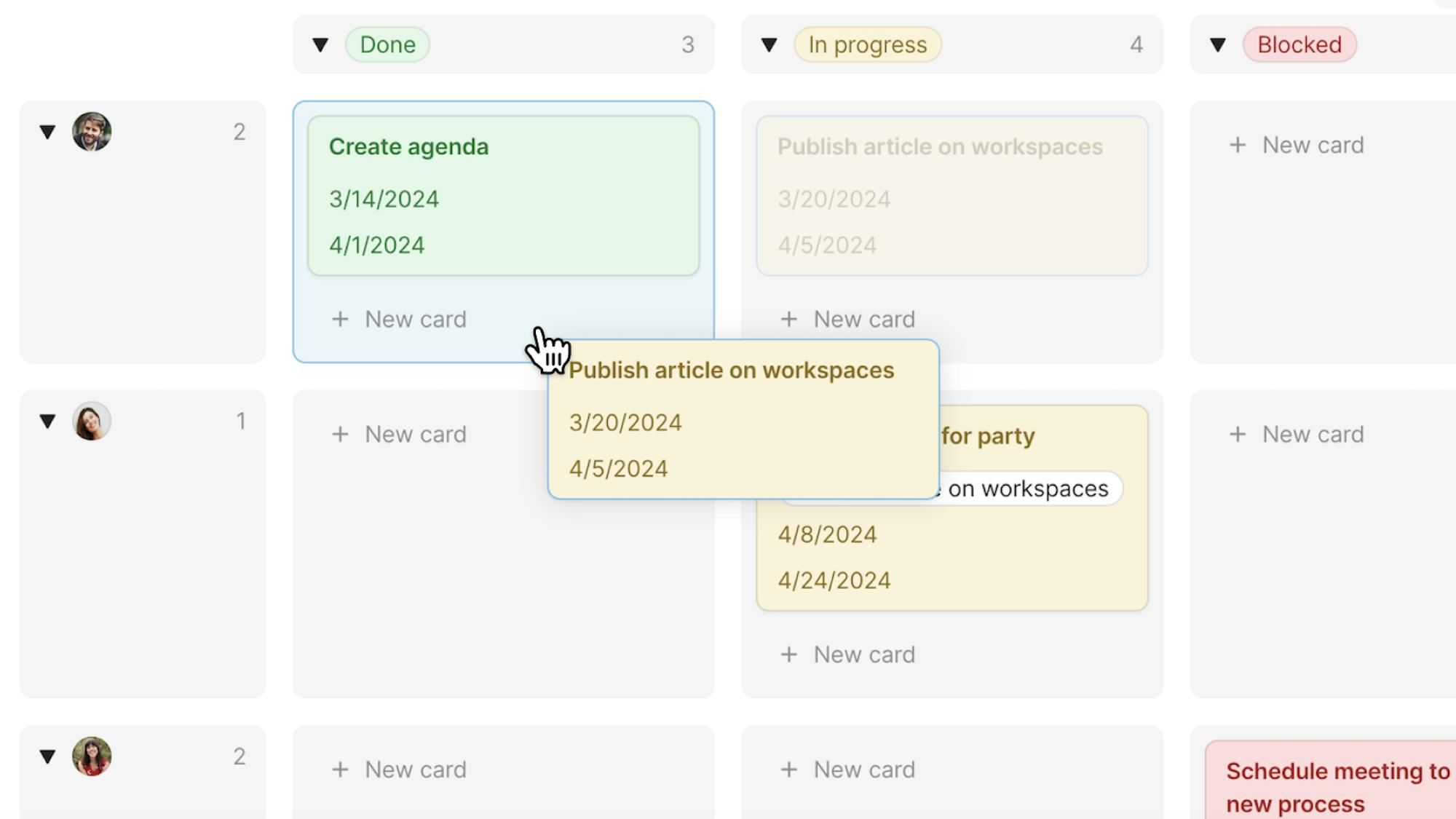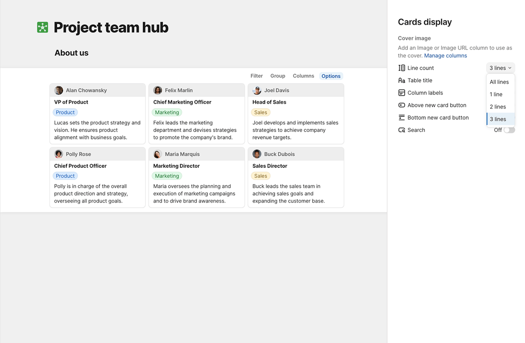 You can now group a card view along two dimensions— top and left—to manage tasks and visualize responsibilities more intuitively. This option opens up the ability to create swim lanes or Kanban boards grouped by status, team, and more.