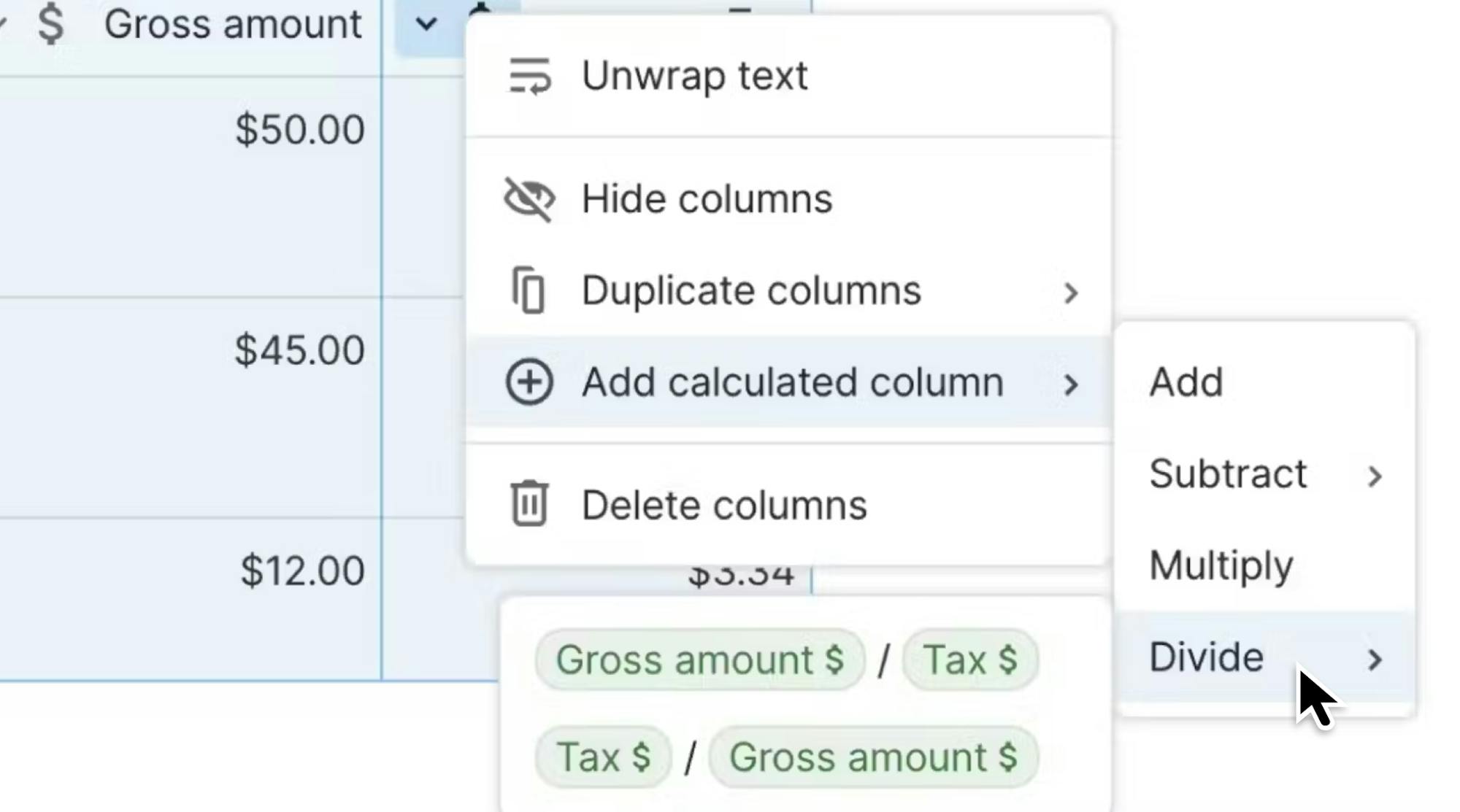 Use these new column options to perform calculations or concatenate data in 2 columns.
