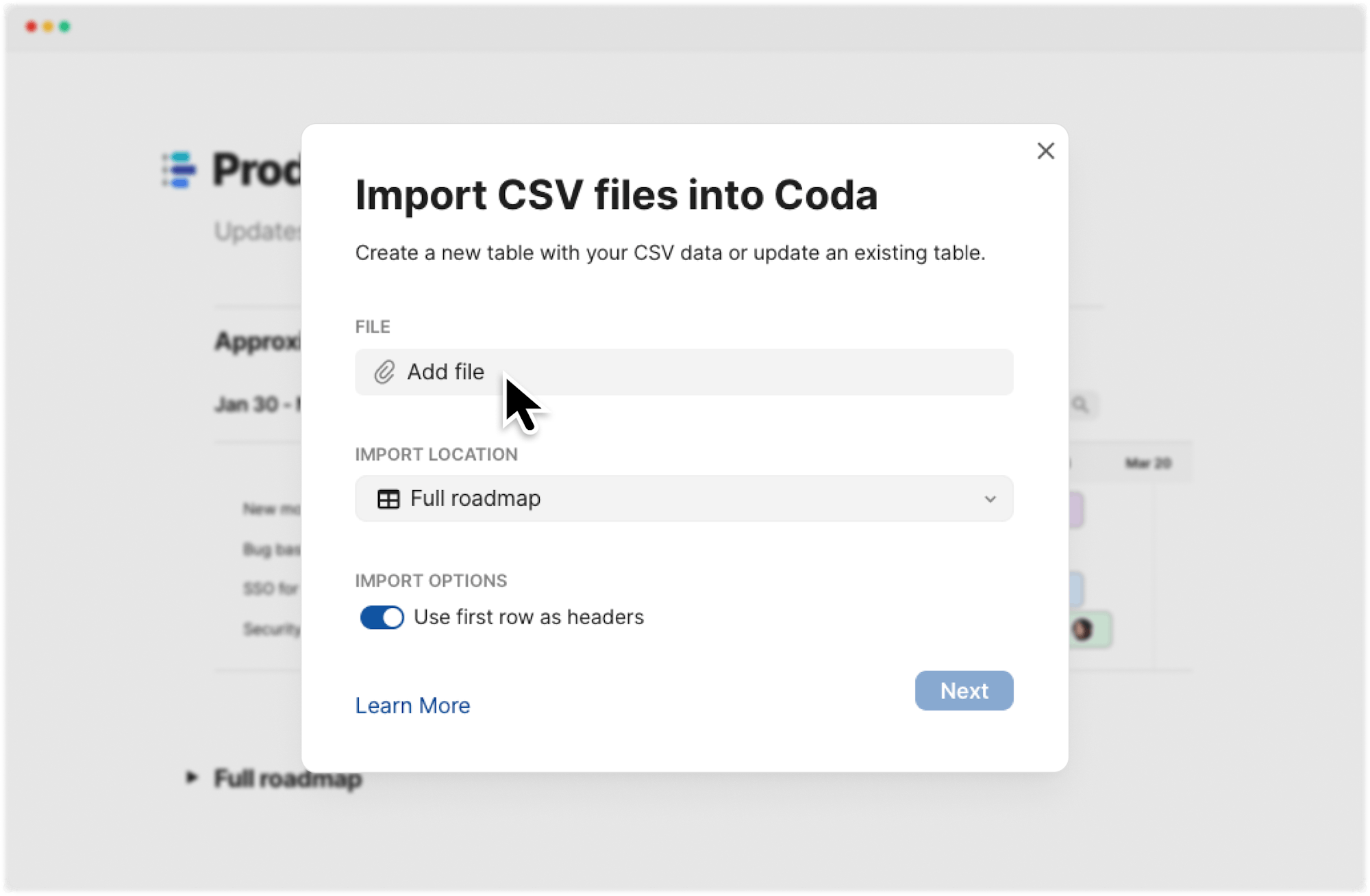 Now in beta, the CSV importer lets you add CSV files into existing tables in your Coda doc.