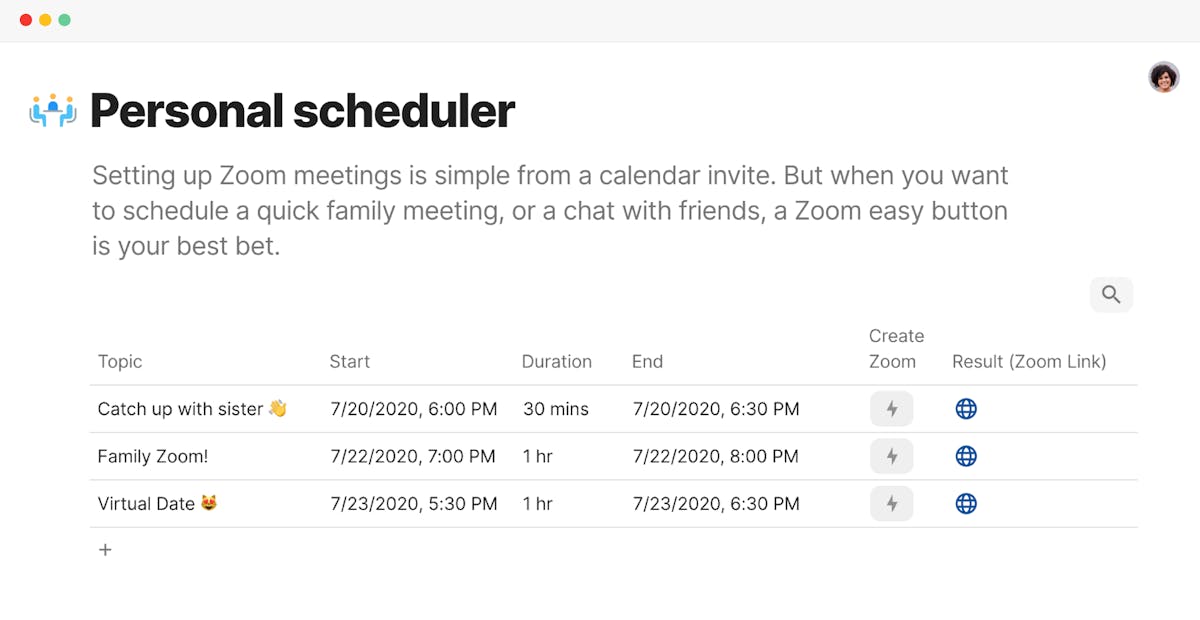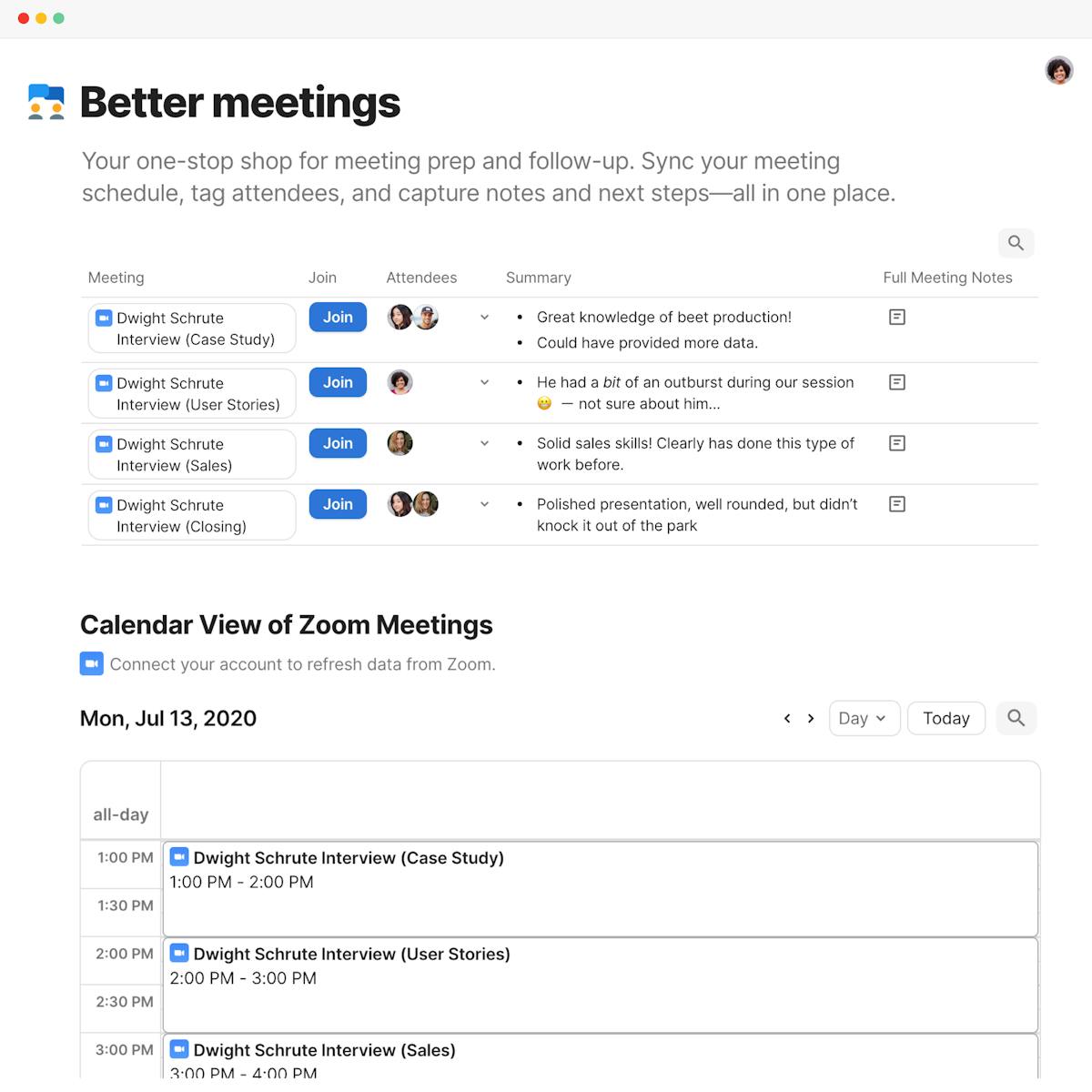 As your organization grows, admin for meetings takes up more and more valuable time. Let Coda + Zoom manage the tedious work of scheduling meetings, creating Zoom links, and sending out regular invites.